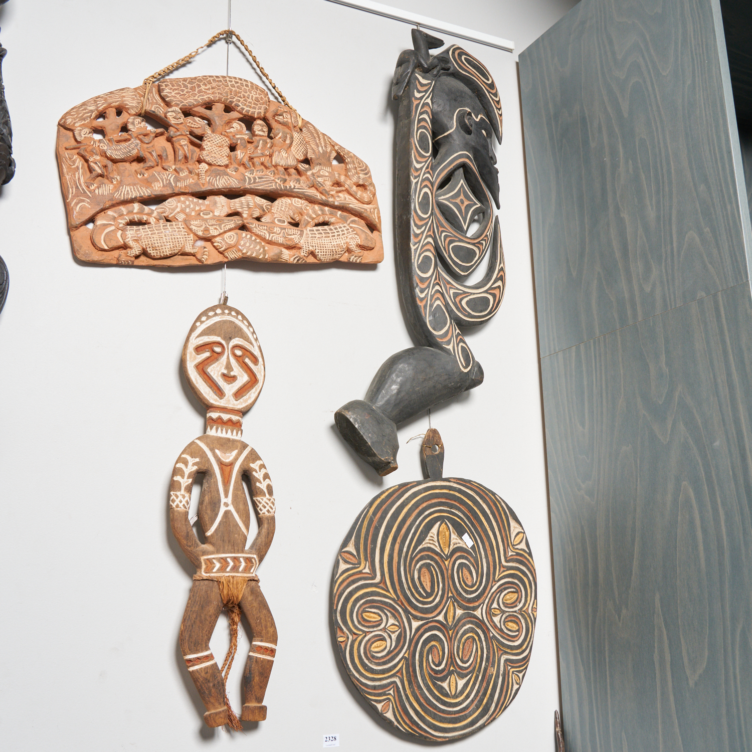 A PAPUA NEW GUINEAN STORY BOARD TOGETHER A TWO SIDED FACE AND HOOK, A TIMBER FIGURED HAND FAN, AND A FLAT MALE FIGURE L.75CM