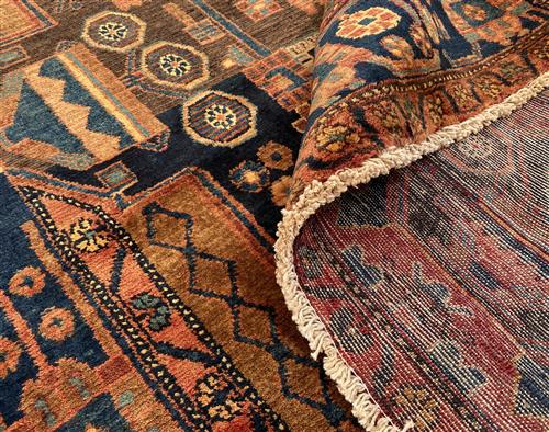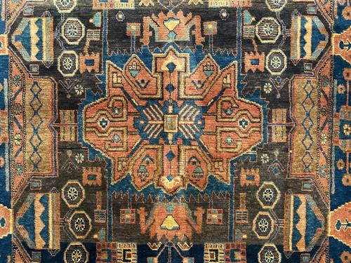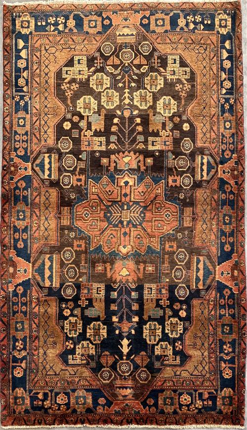 A TRIBAL PERSIAN NAHAVAND RUG. 100% HAND-SPUN WOOL PILE & VEGETABLE DYES WITH NATURAL ABRASH. HAND-KNOTTED VILLAGE WEAVE FROM THE HAMADAN PROVINCE WITH A CENTRAL BOLD MEDALLION WITHIN A FIELD OF VARYING FLORAL MOTIFS & TREE OF LIFE PATTERNS. FLORAL- PATTERNED BORDER. THE ENTIRE IN SHADES OF INDIGO, BROWN, CREAM, TERRACOTTA & BLUE. SIZE: 282 X 160 CM ORIGIN: IRAN (PLEASE NOTE THERE MAY BE SOME COLOUR VARIATION FROM PHOTOGRAPH)
