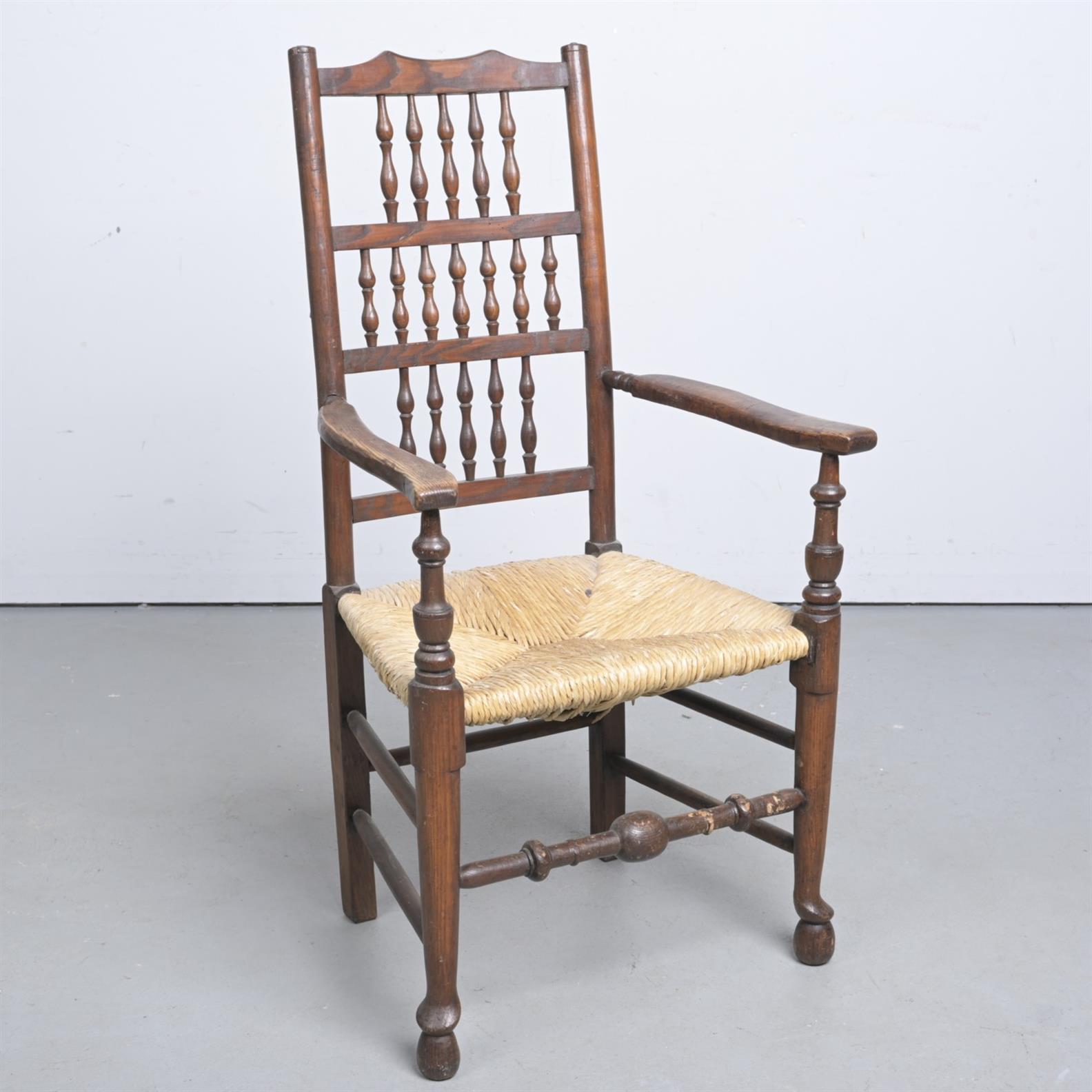 A MID-19th CENTURY LANCASHIRE ELM SPINDLE-BACK ELBOW CHAIR, WITH A RUSH SEAT (112H X 60W X 50D CM)