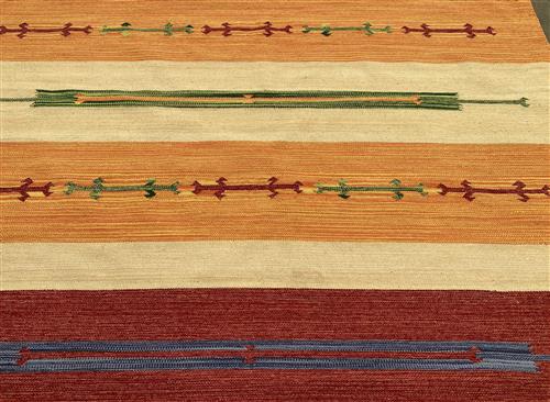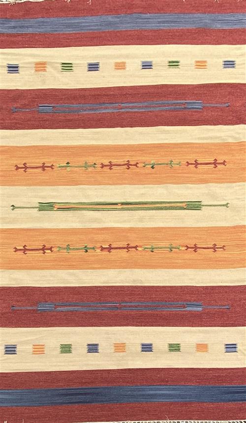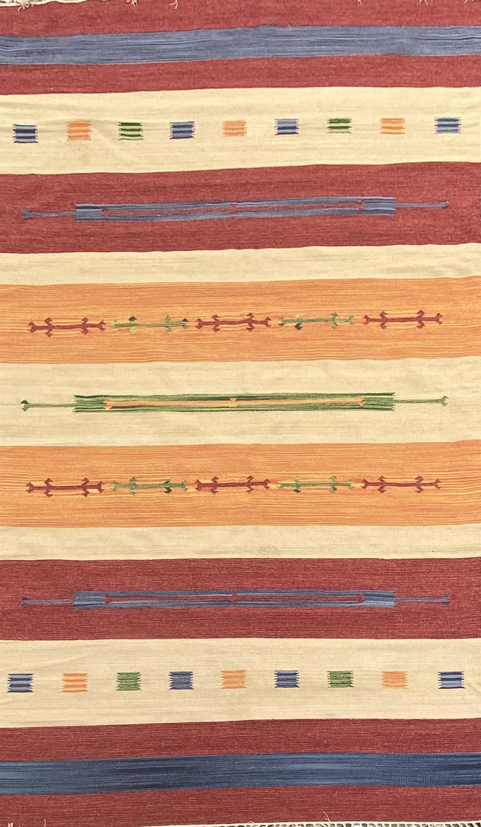 A LARGE CAUCASIAN-INFLUENCED KAZAK DESIGN KILIM, FINELY HAND WOVEN WITH 100% FINE CHENILLE COTTON. REVERSABLE FLATWEAVE, IN SHADES OF CREAM, RED, ORANGE, GREEN & BLUE. SIZE: 290 X 190 CM ORIGIN: RAJASTHAN (PLEASE NOTE THERE MAY BE SOME COLOUR VARIATION FROM PHOTOGRAPH)