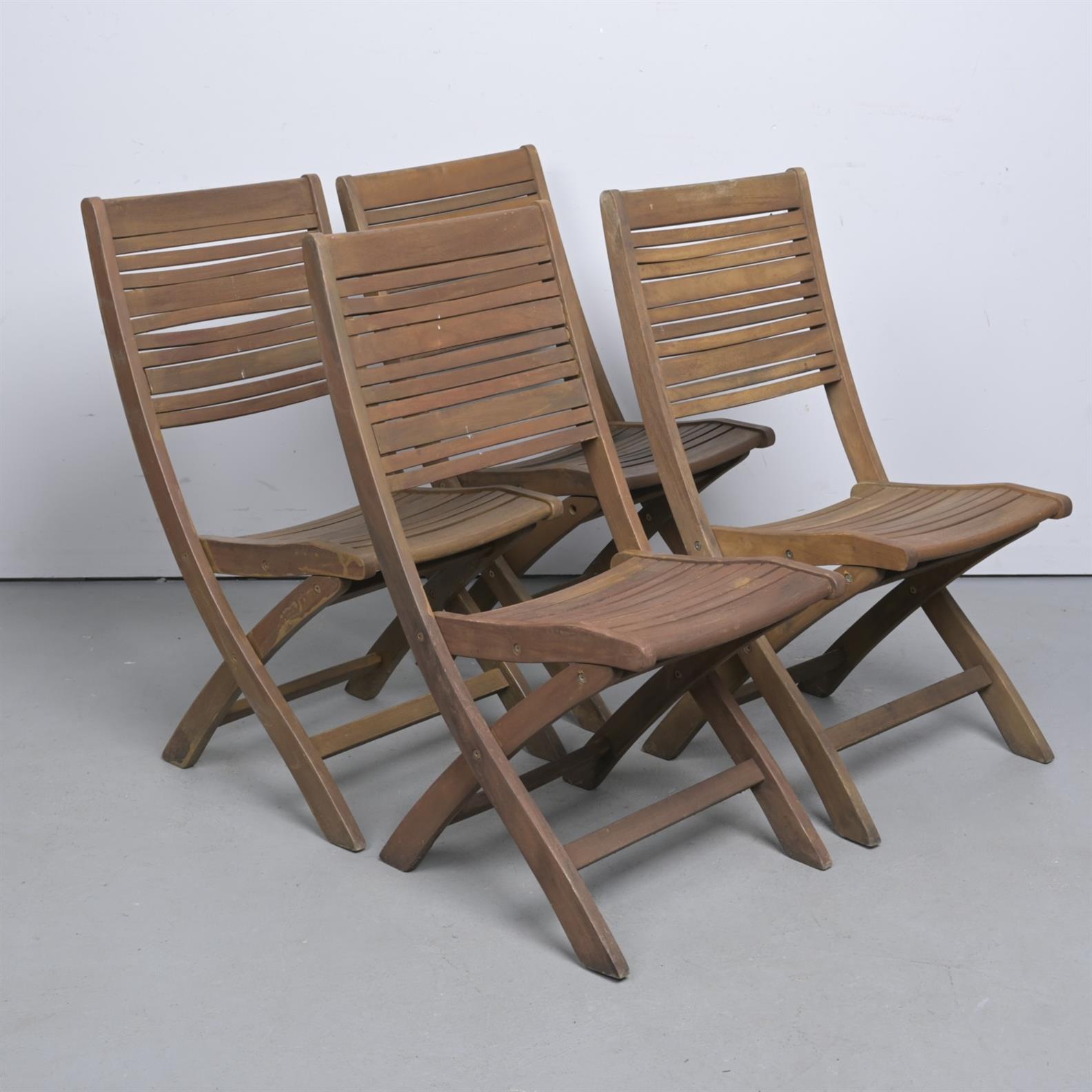 A SET OF FOUR TEAK OUTDOOR FOLDING CHAIRS (88H X 41W X 40D CM)