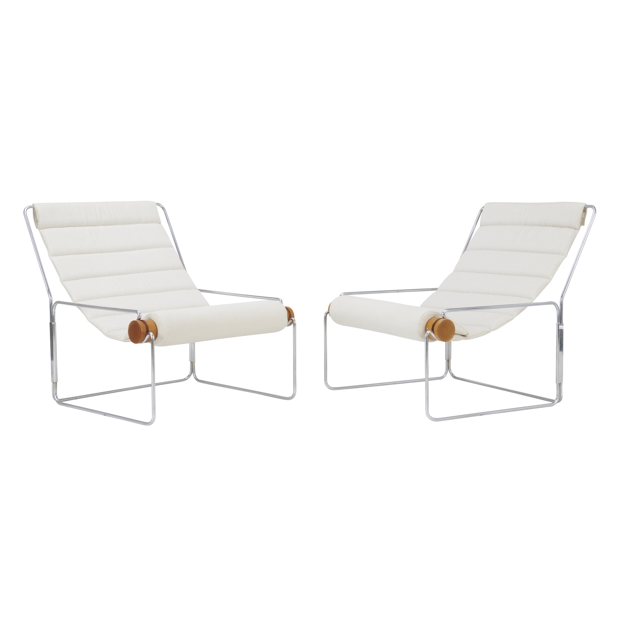Unique folding design. Ribbed ecru coloured textile sling seat on chromed metal tube frame with large wooden dowel horizontal support.