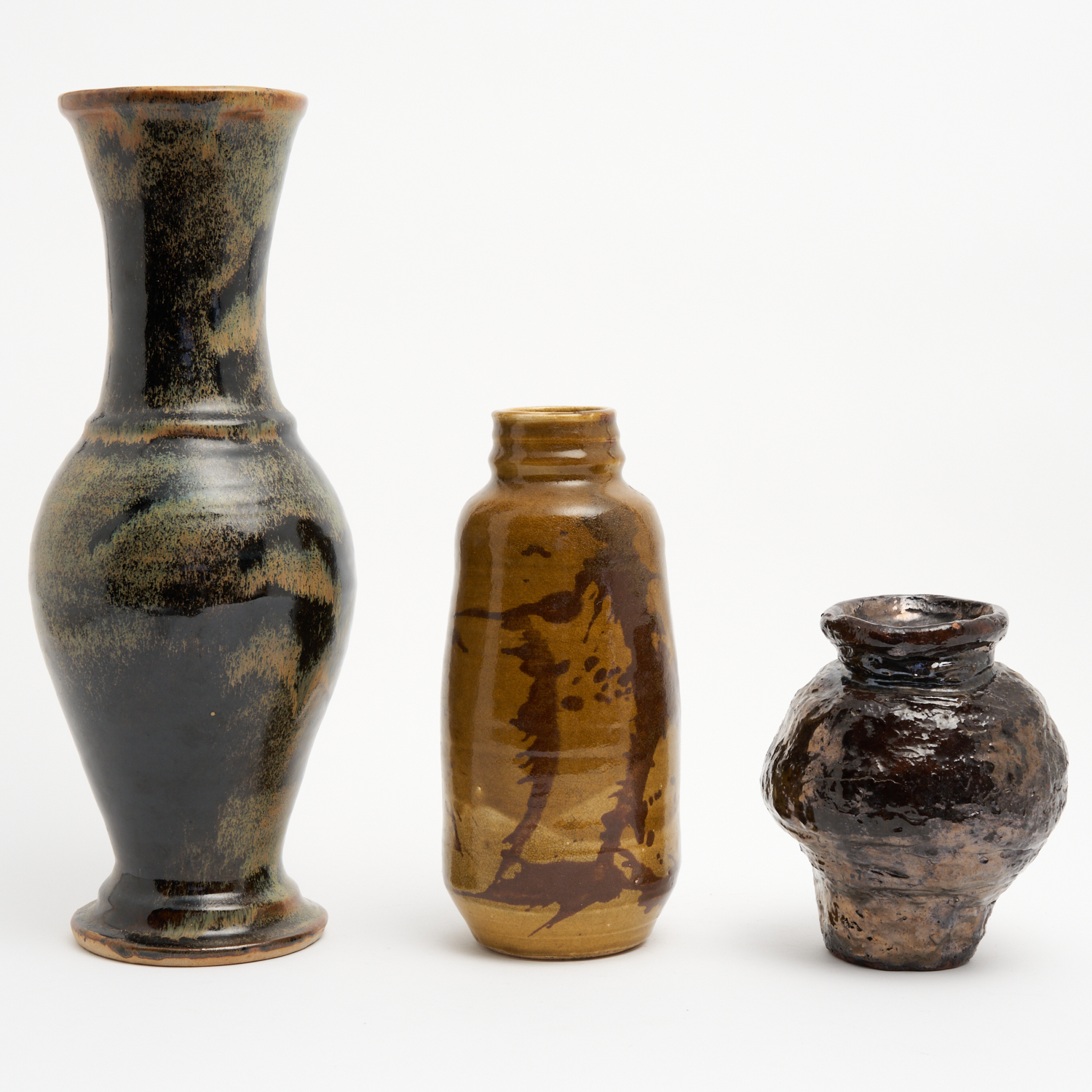THREE VINTAGE AUSTRALIAN POTTERY VASES IN BROWN GLAZES H.44.4CM (TALLEST)