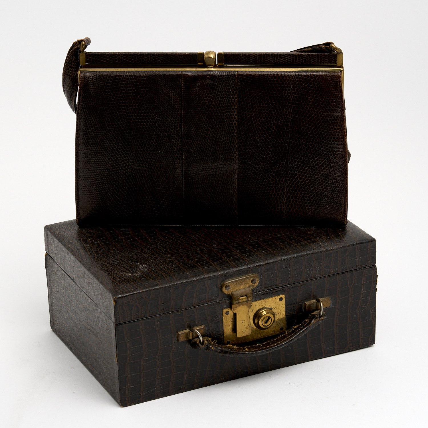 A LADY'S LEATHER HAND BAG AND A LEATHER MAKE UP CASE L.27CM (LONGEST)