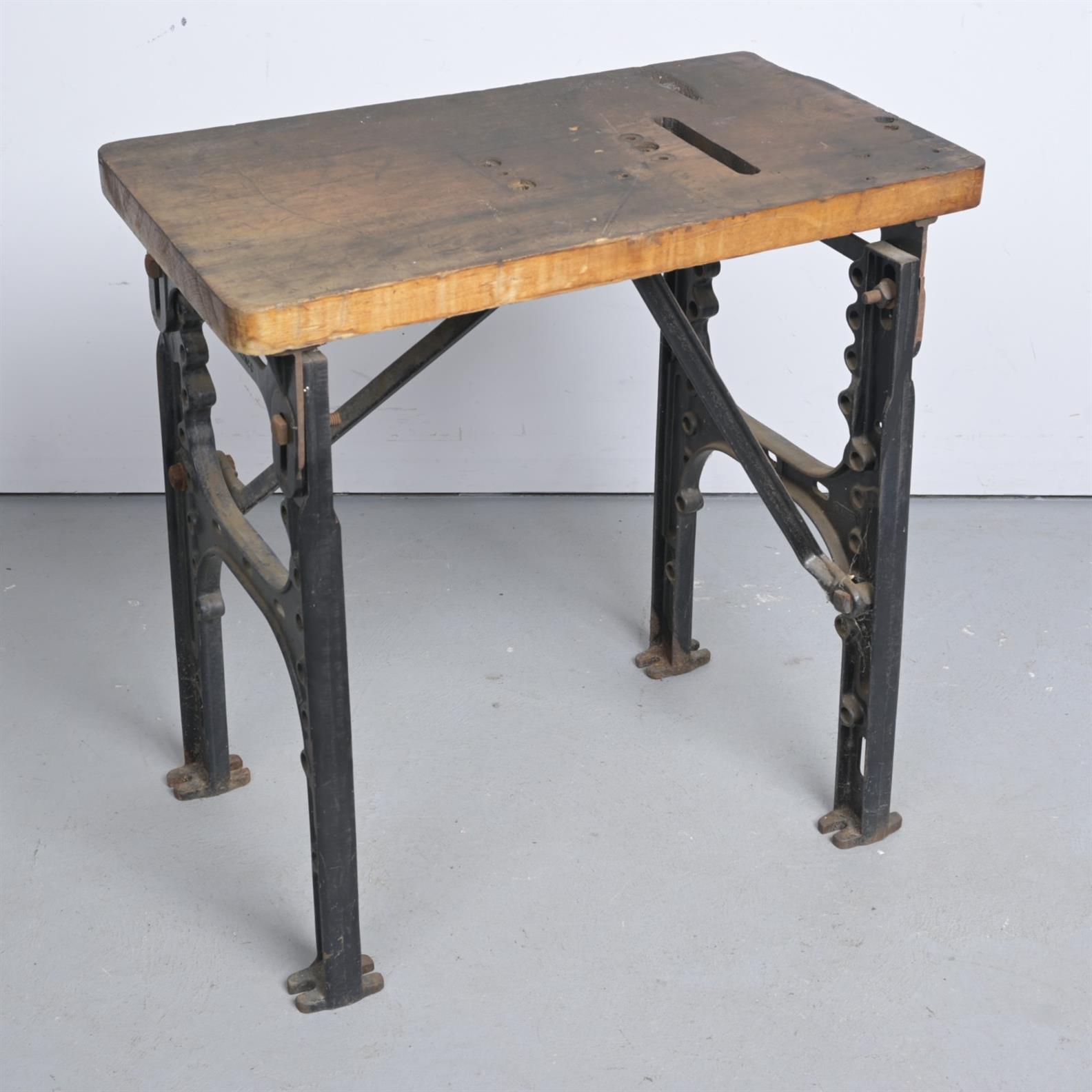 A CAST METAL SEWING TABLE BASE WITH LATER WOODEN TOP (A/F) (80H X 79W X 42.5D CM)
