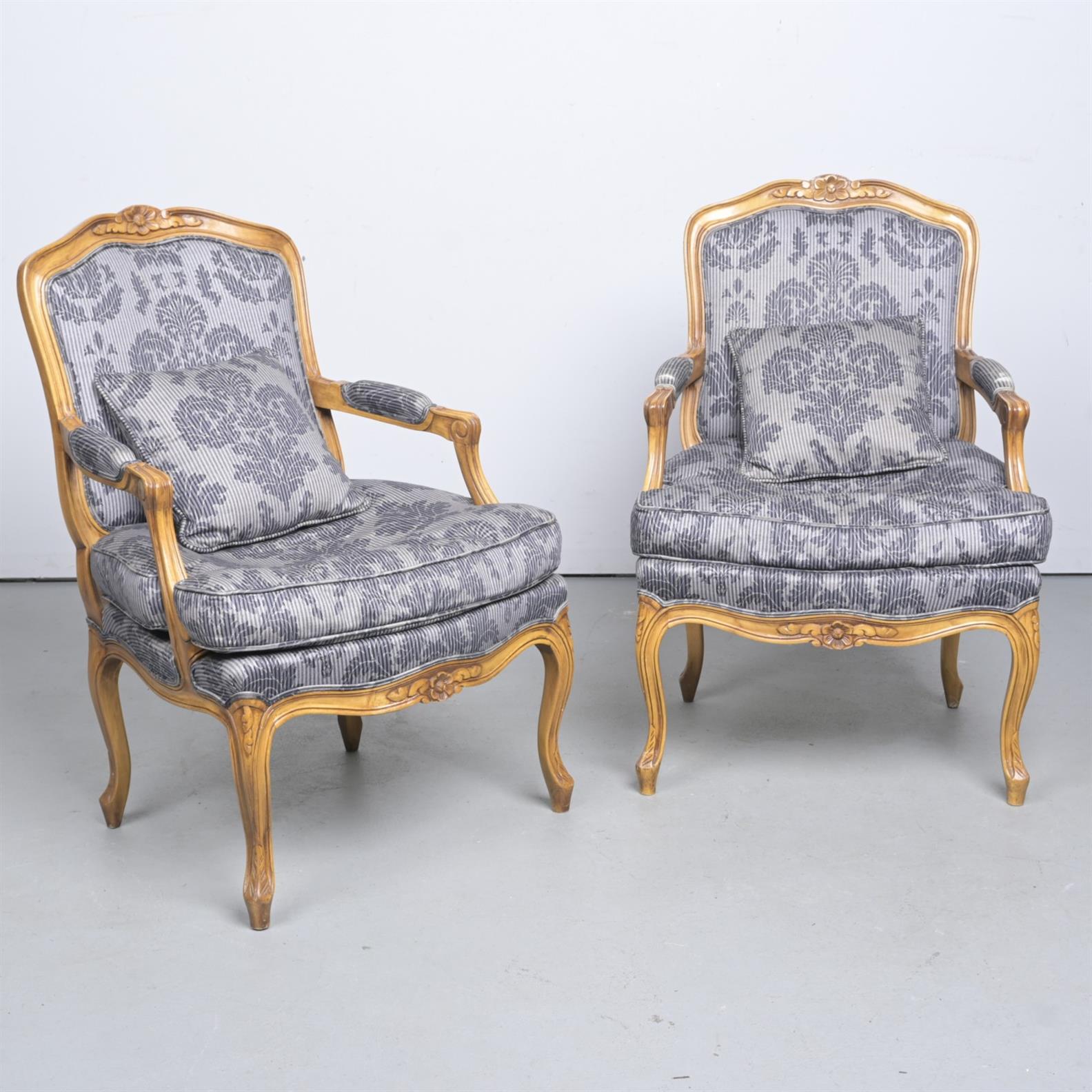 A PAIR OF LOUIS XV-STYLE BEECH AND UPHOLSTERED FAUTEUILS (95CM H X 65CM W X 73CM D)