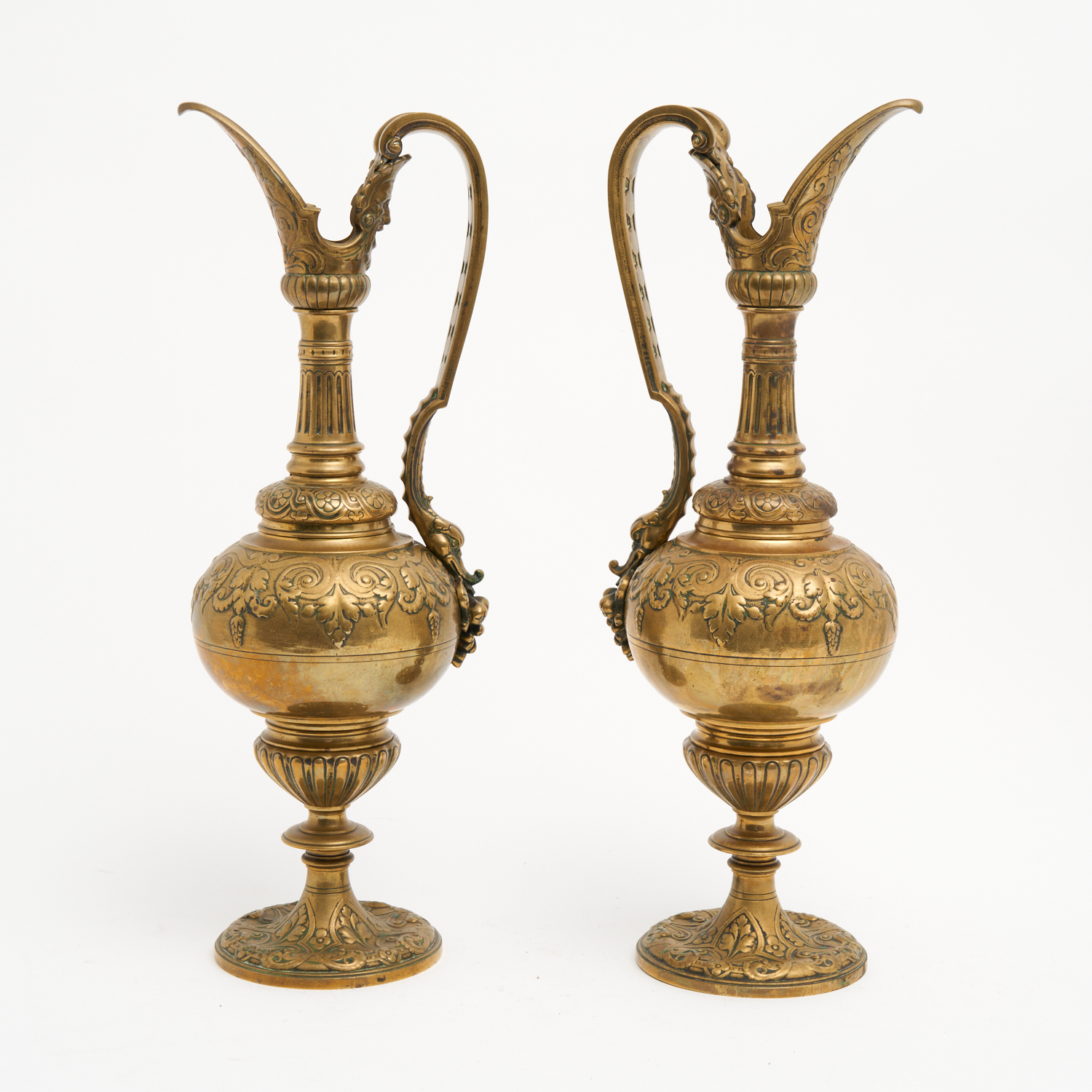 A PAIR OF FRENCH SOLID BRONZE URNS WITH MASK HEAD AND DOLPHIN DECORATED HANDLES H.41CM