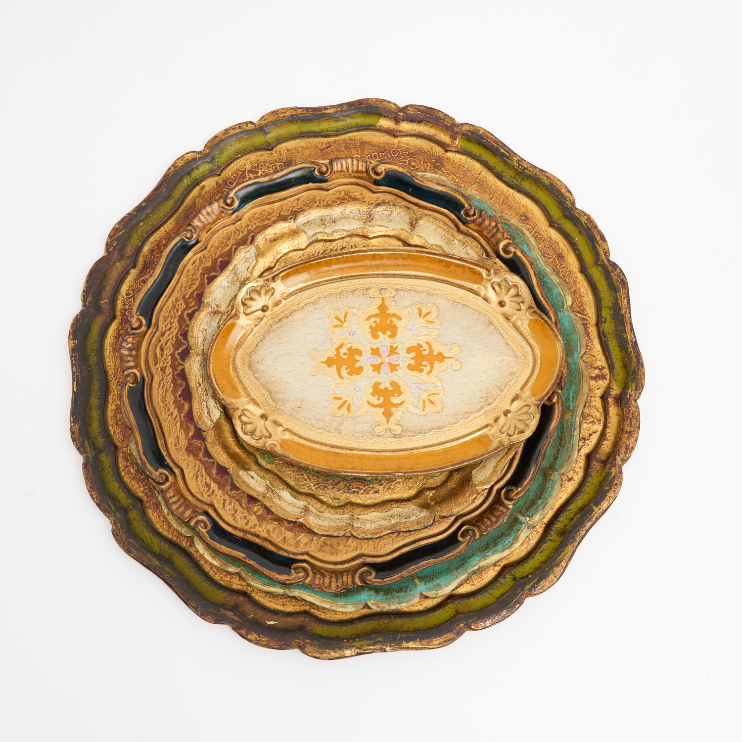 A COLLECTION OF FIVE ITALIAN FLORENTINE GILTWOOD SERVING TRAYS DIA.44CM (LARGEST)