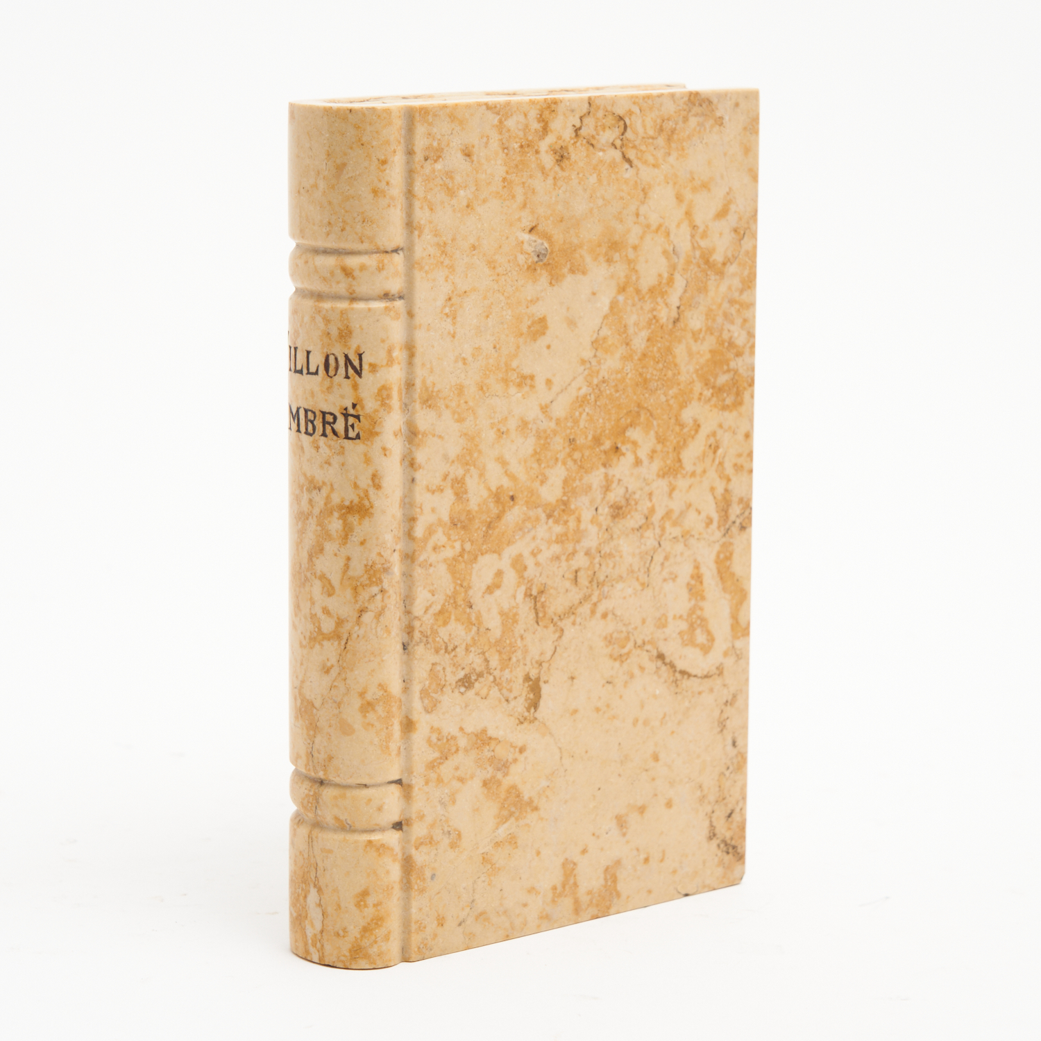 A 19TH CENTURY FRENCH CARVED STONE BOOK FORM PAPERWEIGHT TITLED 'VILLON AMBRE' L.19CM
