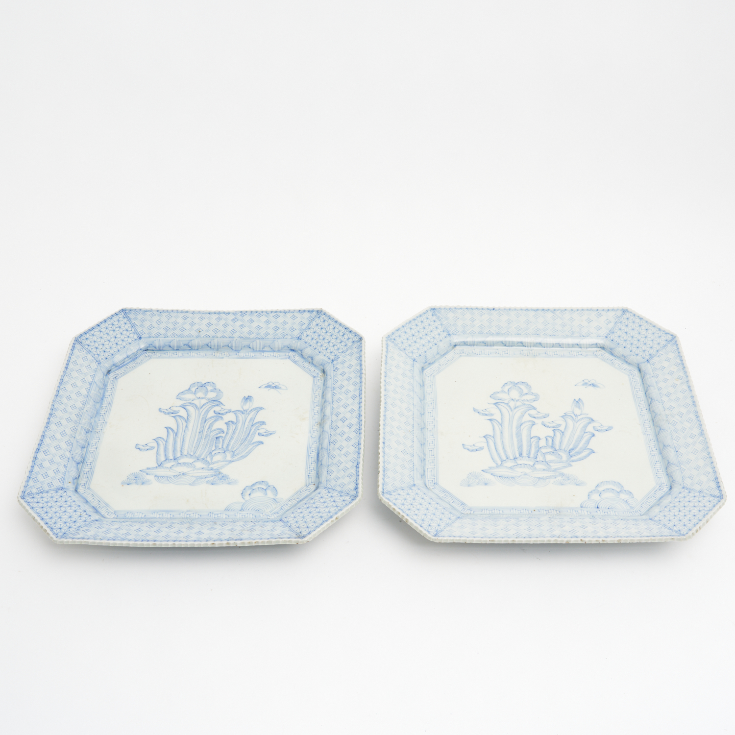 A PAIR OF JAPANESE BLUE AND WHITE OCTAGONAL FORM FLORAL AND BUTTERFLY DECORATED CHARGERS DIA.35CM