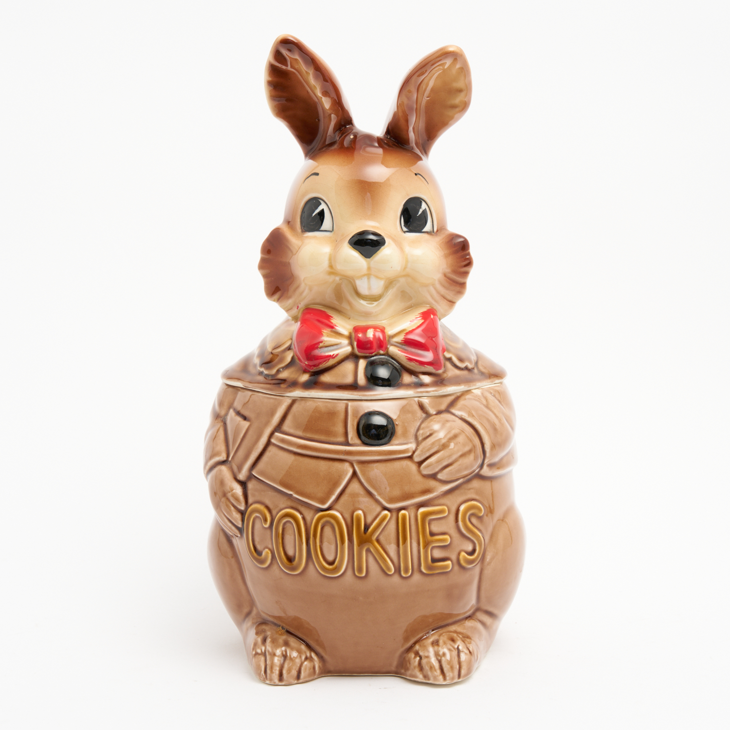 A JAPANESE MID-CENTURY GLAZED PORCELAIN RABBIT FORM COOKIE JAR H.34CM