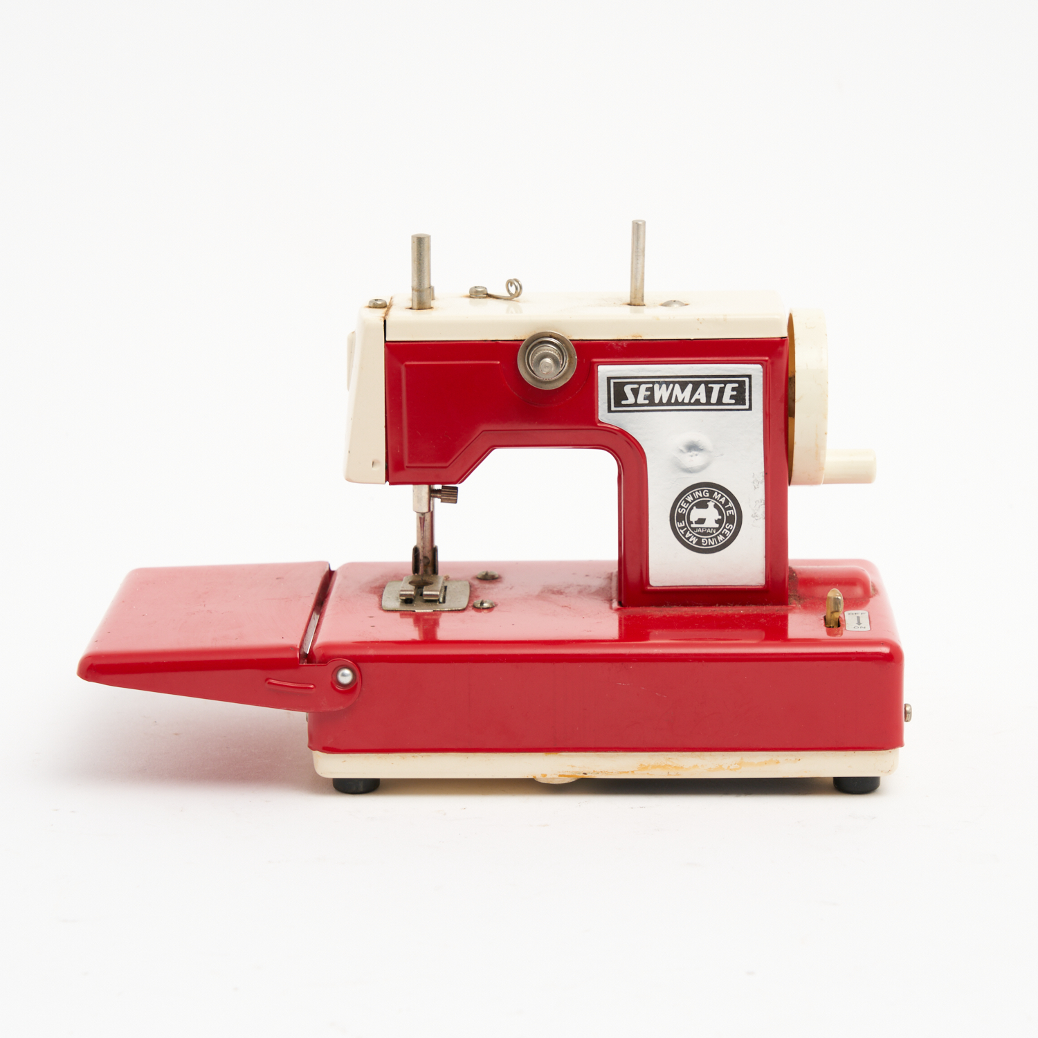 A 1940S JAPANESE SEWMATE METAL AND CHROMED HAND CRANK AND BATTERY POWERED SEWING MACHINE W.22CM