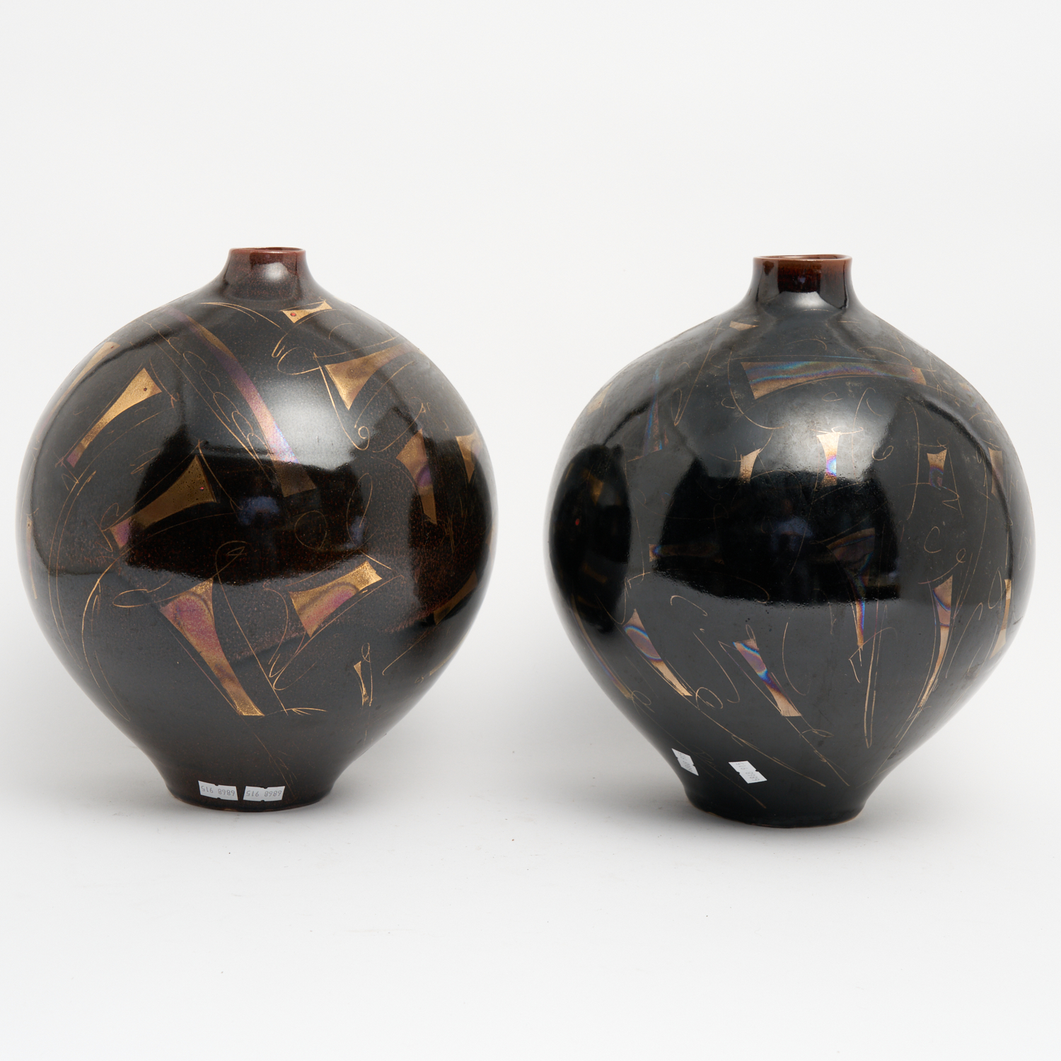 A PAIR OF SPHERICAL GLAZED POTTERY VASES WITH GOLD PATTERNS BY GREG DALY H.34CM