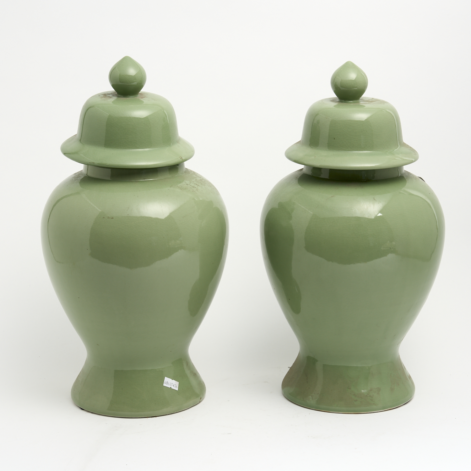 A PAIR OF CHINESE GREEN GLAZED URNS WITH COVERS H.49CM