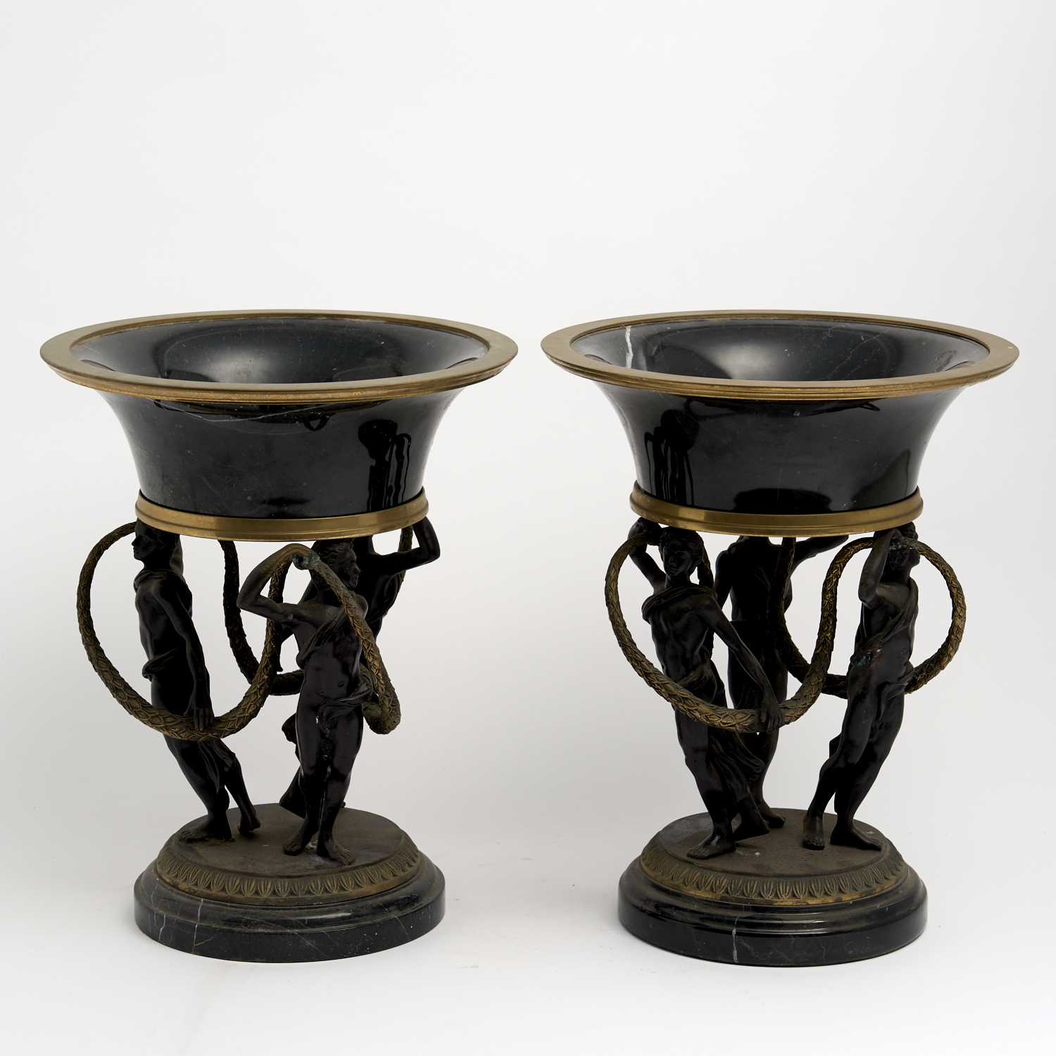 A PAIR OF CLASSICAL STYLE BRONZE AND MARBLE CENTREPIECES 36 X 29CM