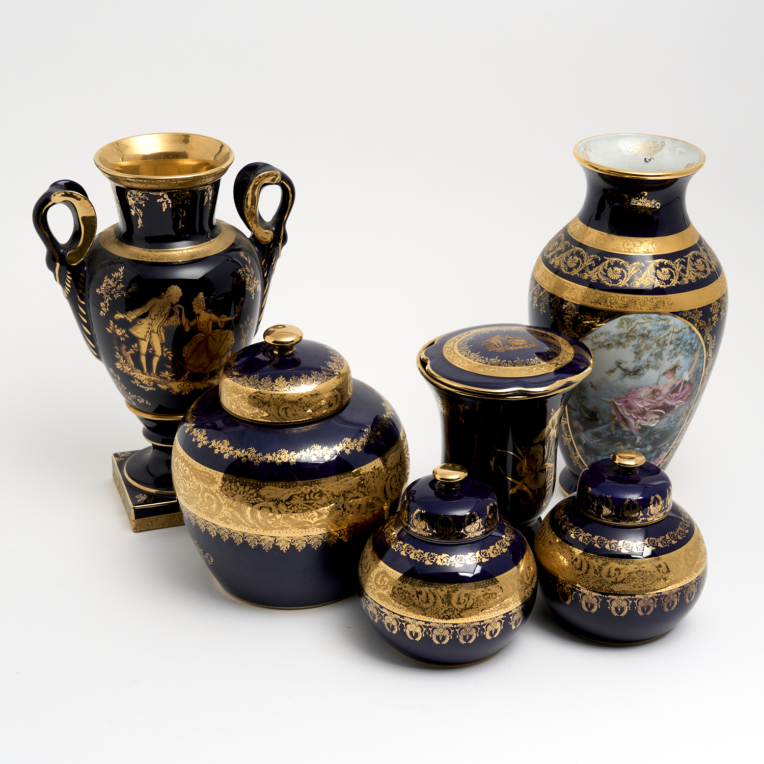 SIX PIECES OF LIMOGES DEEP NAVY GROUND GILT DECORATED PORCELAIN H.30CM (TALLEST)
