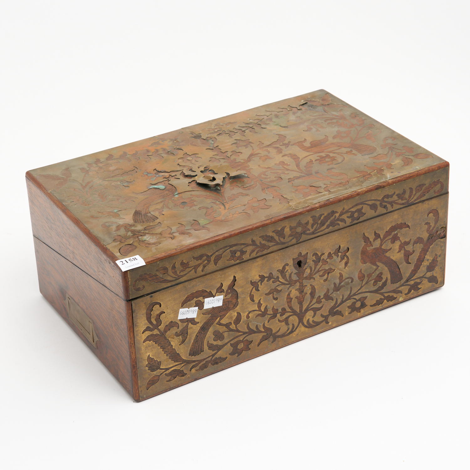 A VICTORIAN ANGLO INDIAN ROSEWOOD BRASS INLAID WRITING SLOPE L.52CM (OPEN) (A/F TO BRASS INLAY)