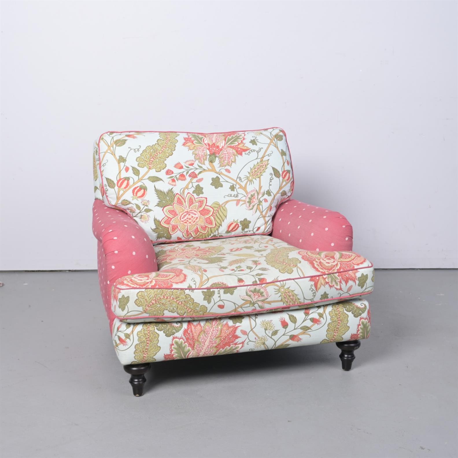 A GENEROUSLY PROPORTIONED UPHOLSTERED ARM CHAIR, IN FLORAL PRINT FABRIC (81CM X 98CM W X 93CM D)