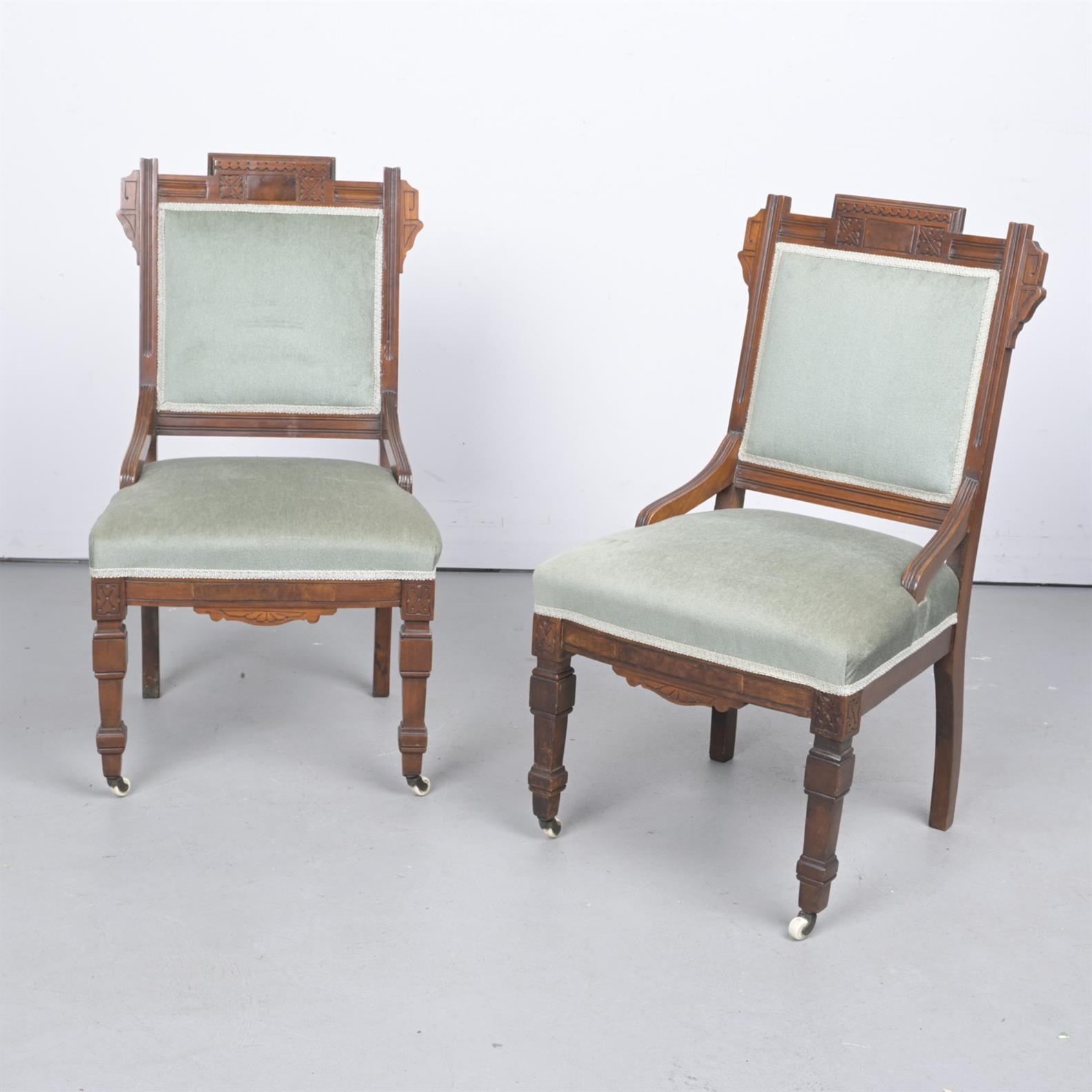 A PAIR OF LATE VICTORIAN WALNUT AND UPHOLSTERED SIDE CHAIRS (A/F) (90CM H X 50CM W X 47CM D )