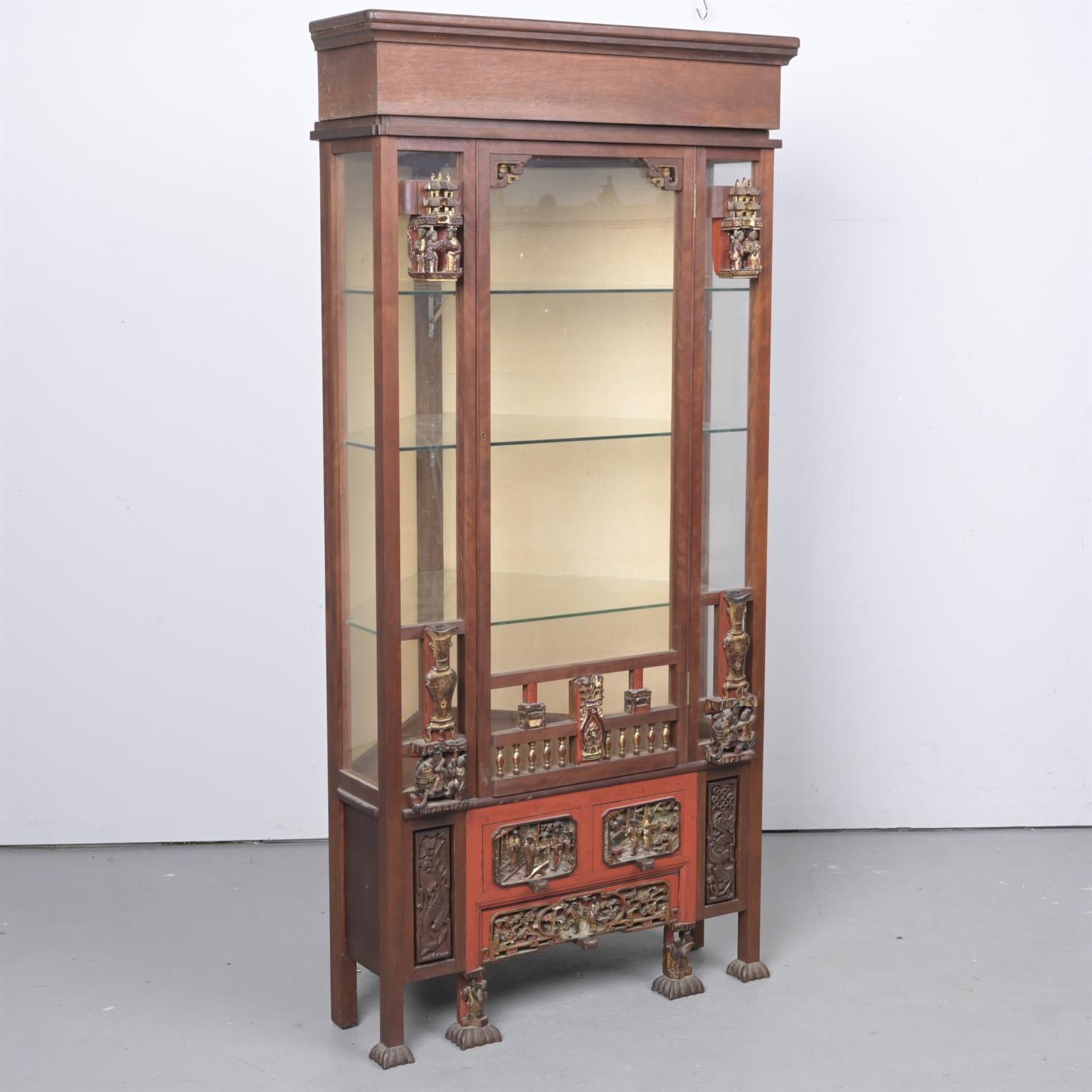A HARDWOOD AND GLAZED CORNER DISPLAY CABINET IN CHINESE MANNER, WITH CARVED DECORATIVE DETAILS - WITH SEPERATE PLINTH BASE OR TOP CAP (184CM H X 83.5CM W X 67CM D) (THIS ITEM MUST BE REMOVED BY CARRIERS AT THE CUSTOMER'S EXPENSE. LEONARD JOEL STAFF CANNOT ASSIST CARRYING THIS ITEM)