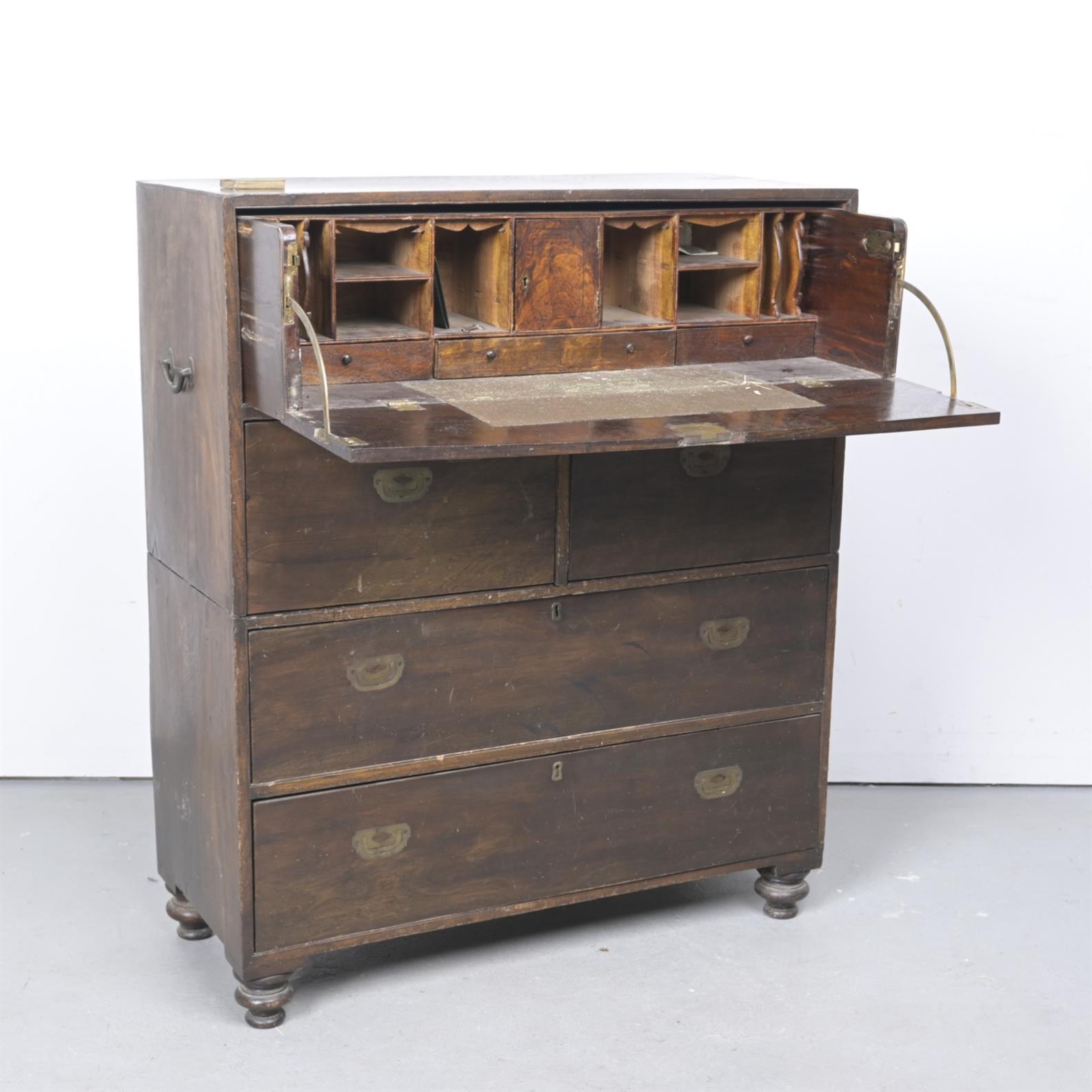 A LATE 19th CENTURY ANGLO-COLONIAL HARDWOOD SECRETAIRE CAMPAIGN CHEST, IN TWO PARTS A/F (115CM H X 95CM W 42CM D) (THIS ITEM MUST BE REMOVED BY CARRIERS AT THE CUSTOMER'S EXPENSE. LEONARD JOEL STAFF CANNOT ASSIST CARRYING THIS ITEM)