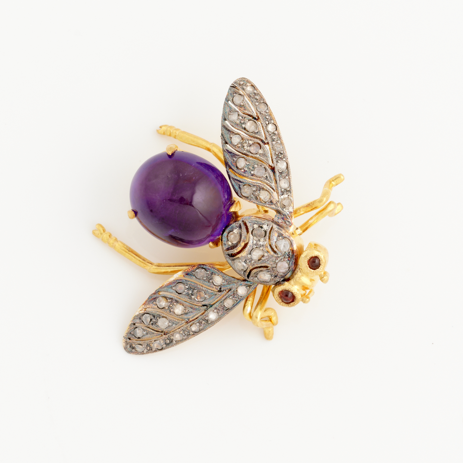 AN AMETHYST AND DIAMOND BROOCH IN SILVER GILT, TO A PIN IN 14CT GOLD, 300MM, 16.2GMS