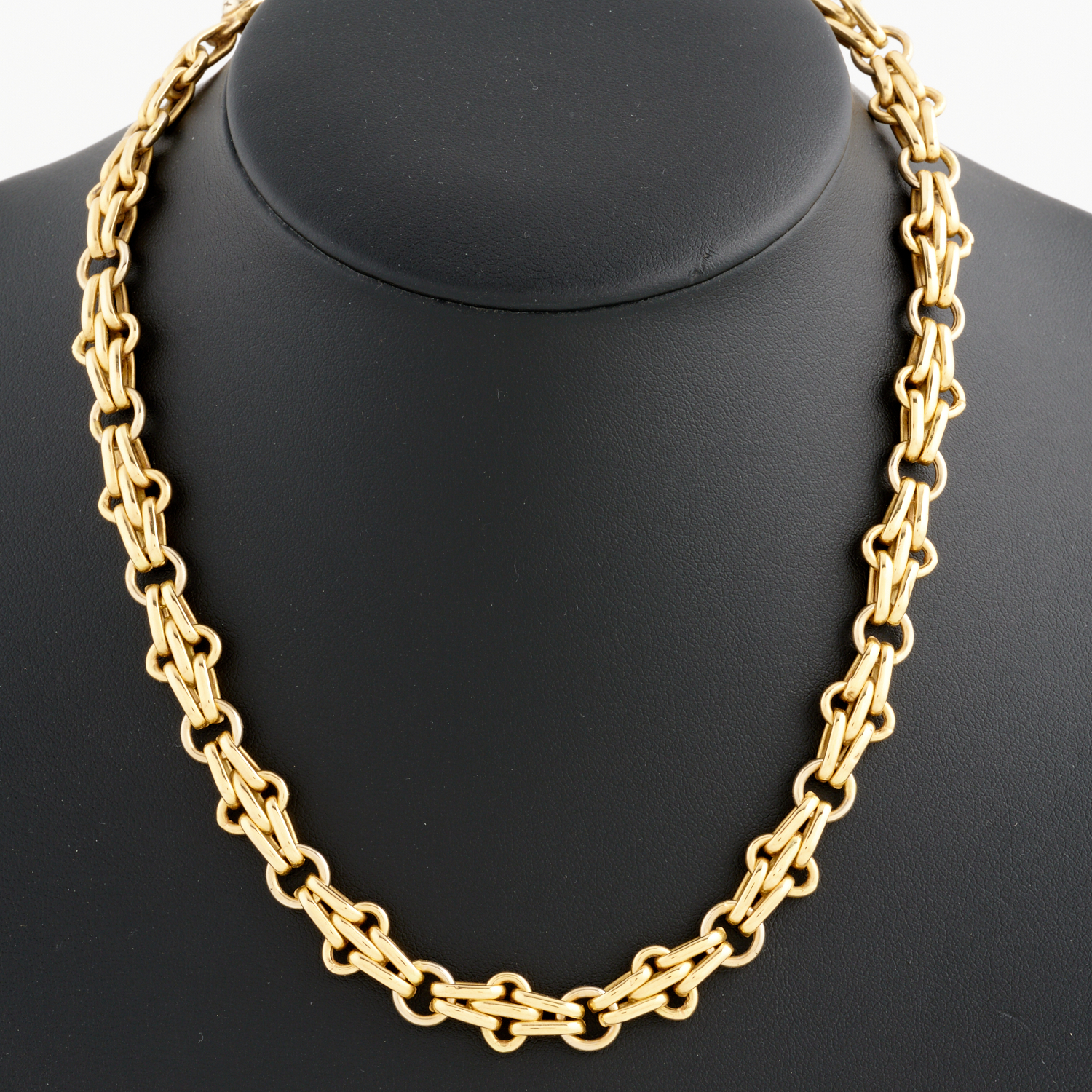 A FANCY LINK CHAIN IN 18CT GOLD, TO A CLASP IN 9CT