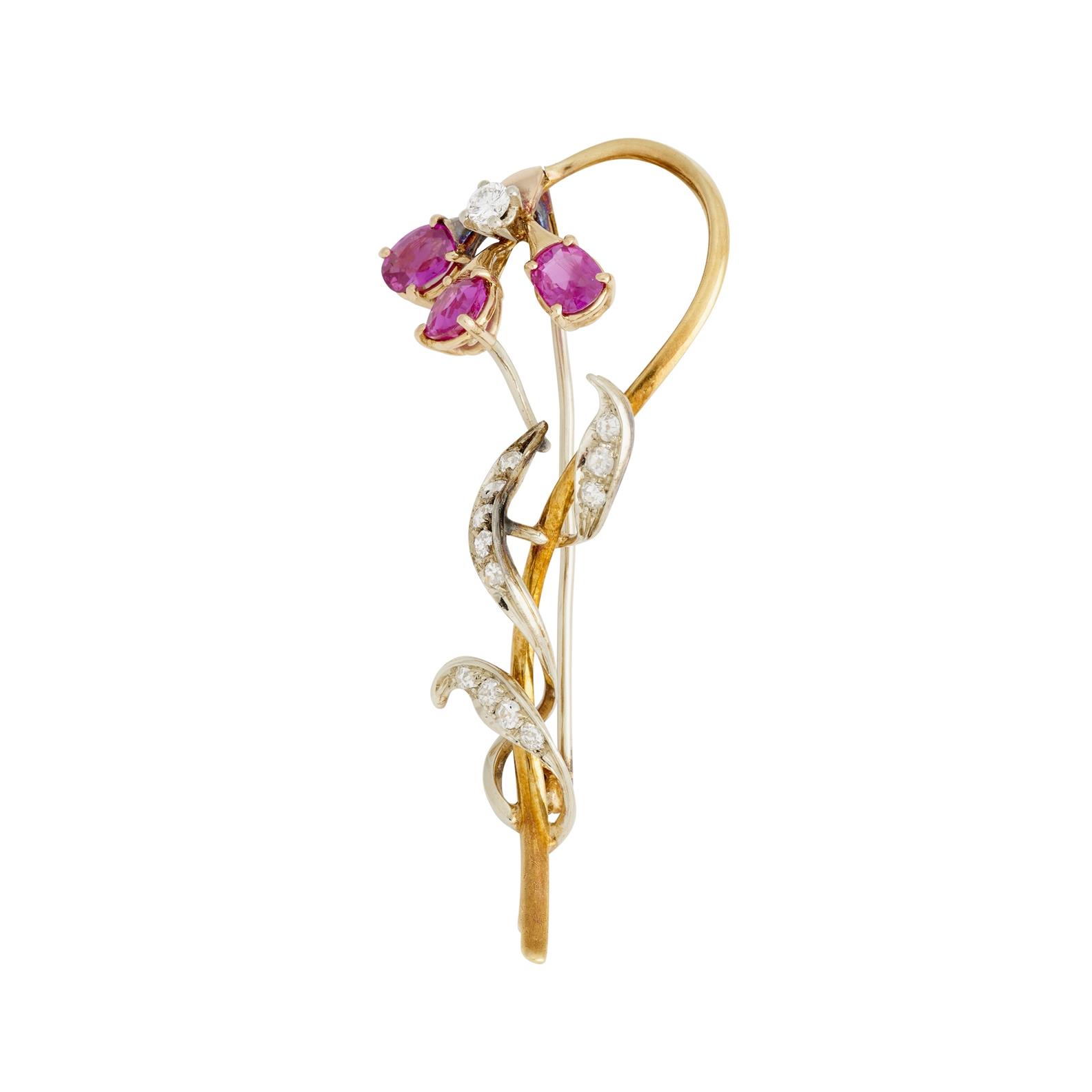 A VINTAGE RUBY AND DIAMOND FLORAL BROOCH IN 18CT TWO TONE GOLD, EACH RUBY APPROXIMATELY 5.2 X 4.7MM, WITH DIAMONDS TOTALLING APPROXIMATELY 0.50CTS, 27 X 60MM, 8.6GMS