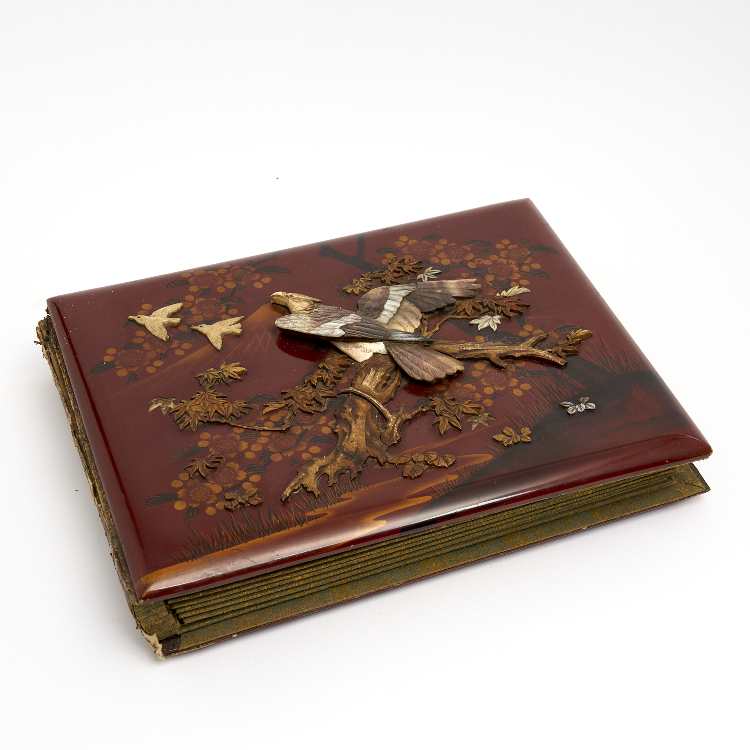 A VINTAGE JAPANESE PHOTO ALBUM WITH INLAID AND APPLIED EAGLE DECORATION, CONTAINING A SELECTION OF VINTAGE JAPANESE POSTCARDS (A/F) W.36CM