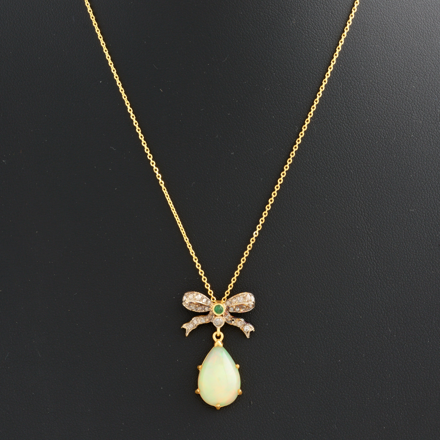 AN OPAL AND DIAMOND PENDANT IN SILVER GILT TO A 14CT GOLD BALE, OPAL TOTALLING 2.9CTS, 30MM