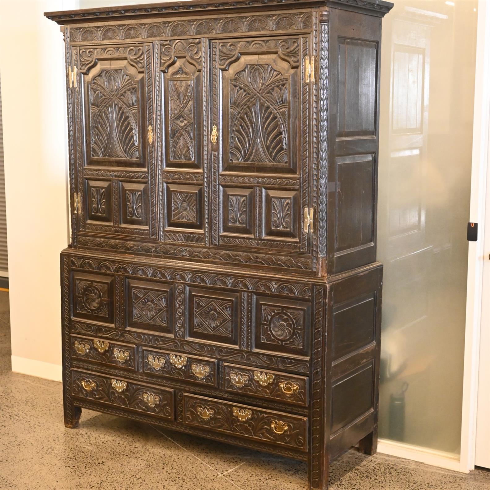 A GEORGE III OAK HOUSEKEEPER'S CUPBOARD, IN TWO PARTS, WITH 19th CENTURY CARVING (A/F) (THIS ITEM MUST BE REMOVED BY CARRIERS AT THE CUSTOMER'S EXPENSE. LEONARD JOEL STAFF CANNOT ASSIST CARRYING THIS ITEM)