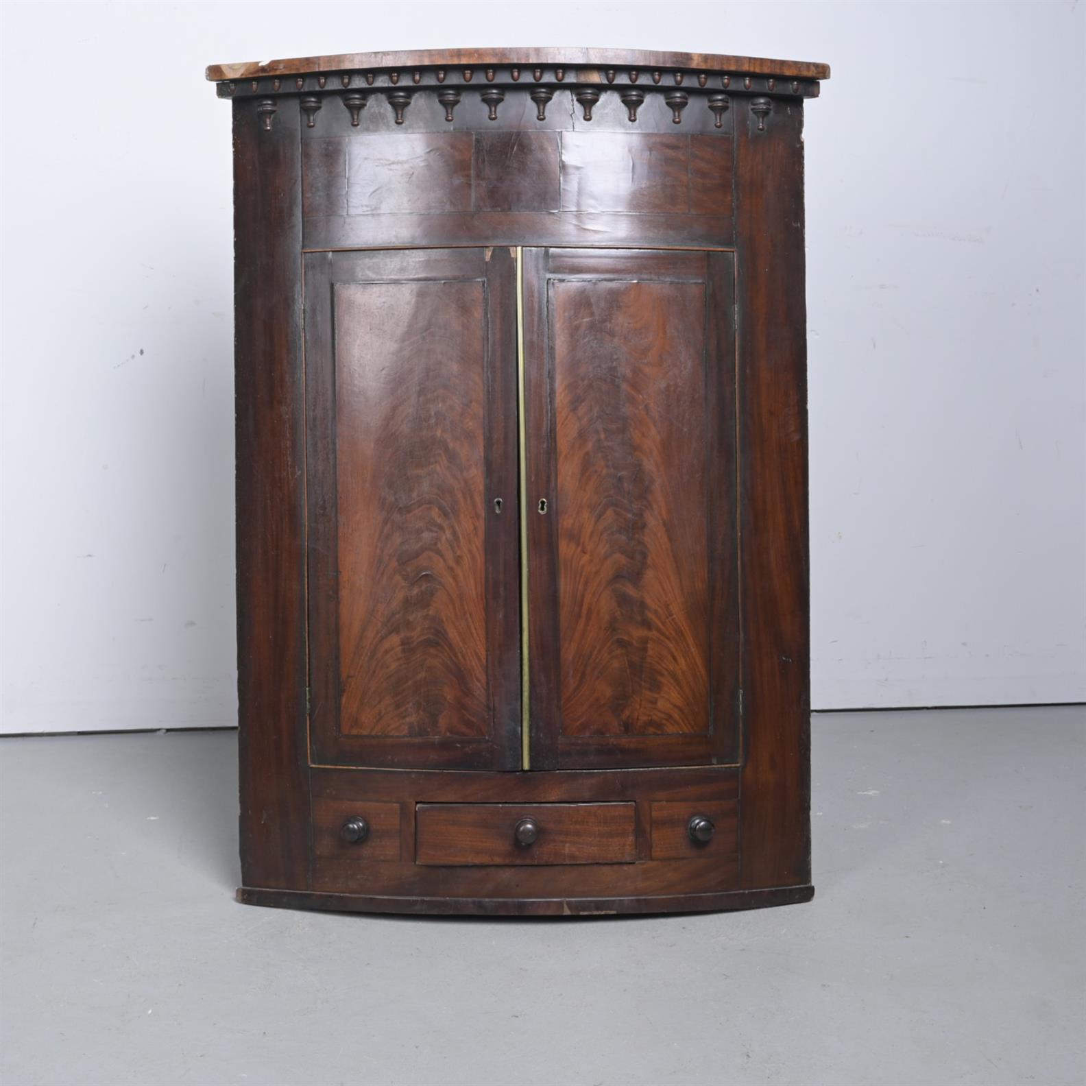 A LATE GEORGE III MAHOGANY BOW-FRONT HANGING CORNER CUPBOARD (A/F) (126H X 93W X 52D CM)