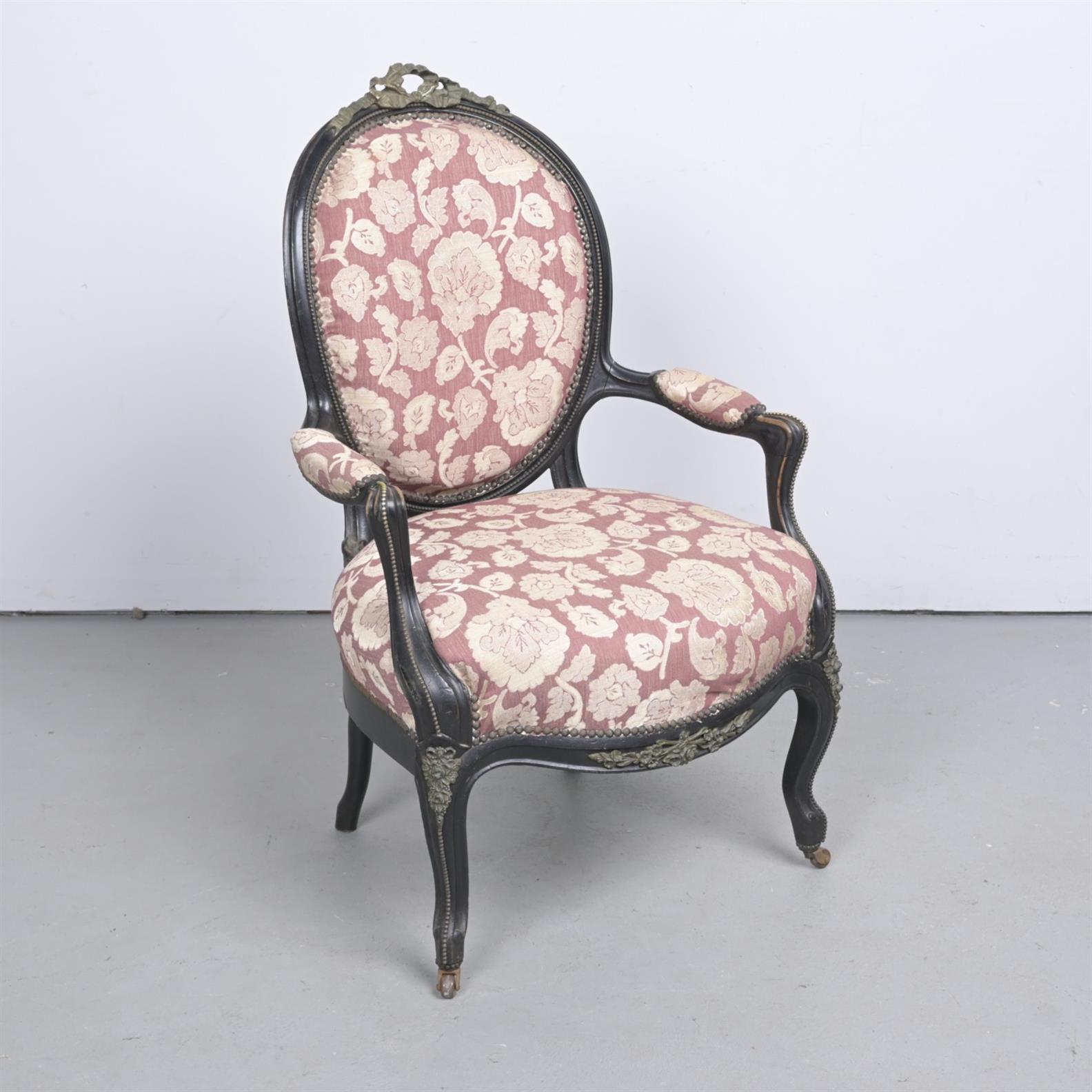 A VICTORIAN EBONISED WALNUT OPEN ARMCHAIR IN FRENCH MANNER ( 100H X 63W X 70D CM)
