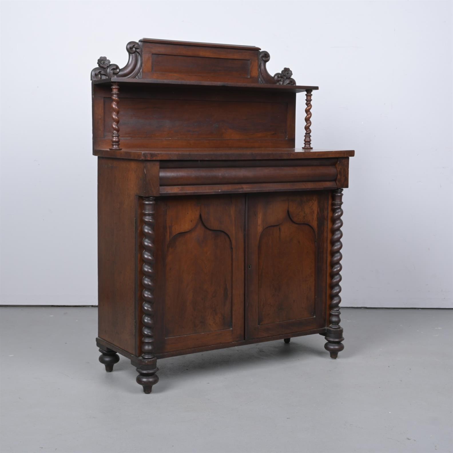 A SMALL EARLY VICTORIAN MAHOGANY SIDEBOARD (A/F) (143CM H X 106CM W X 45CM W) (THIS ITEM MUST BE REMOVED BY CARRIERS AT THE CUSTOMER'S EXPENSE. LEONARD JOEL STAFF CANNOT ASSIST CARRYING THIS ITEM)