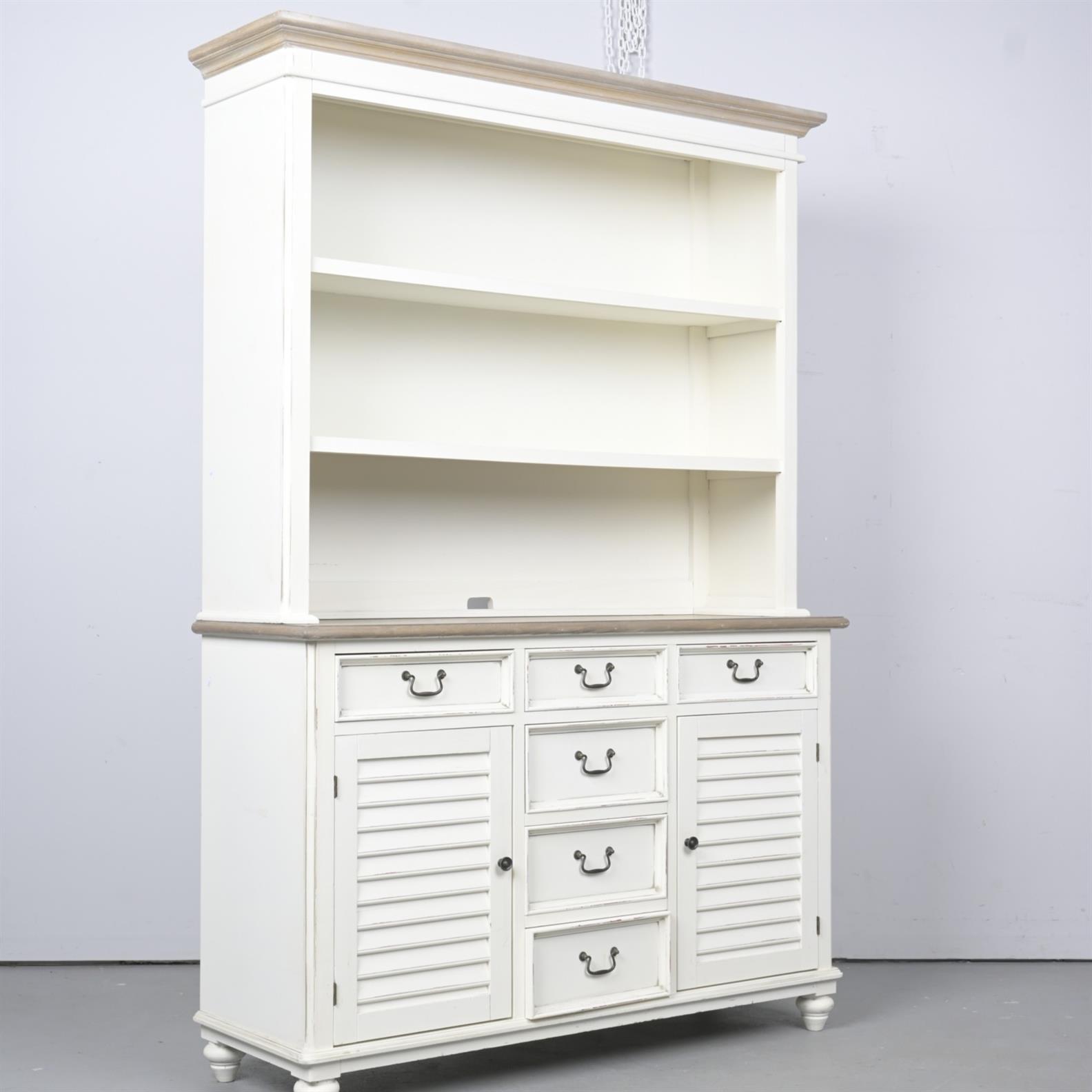 A WHITE-PAINTED KITCHEN DRESSER IN PROVINCIAL ANTIQUE MANNER (A/F) (203CM H X 136CM W X 45CM D)