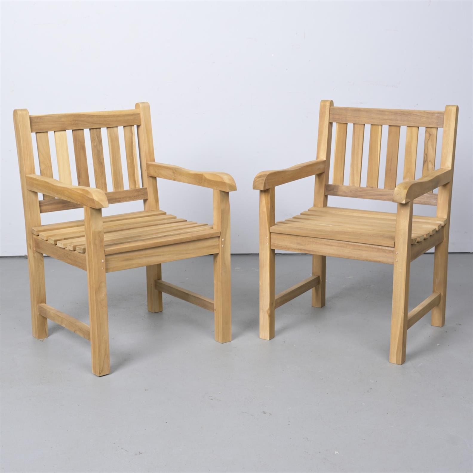 A PAIR OF TEAK CARVER OUTDOOR CHAIRS (90H X 60W X 64D CM)