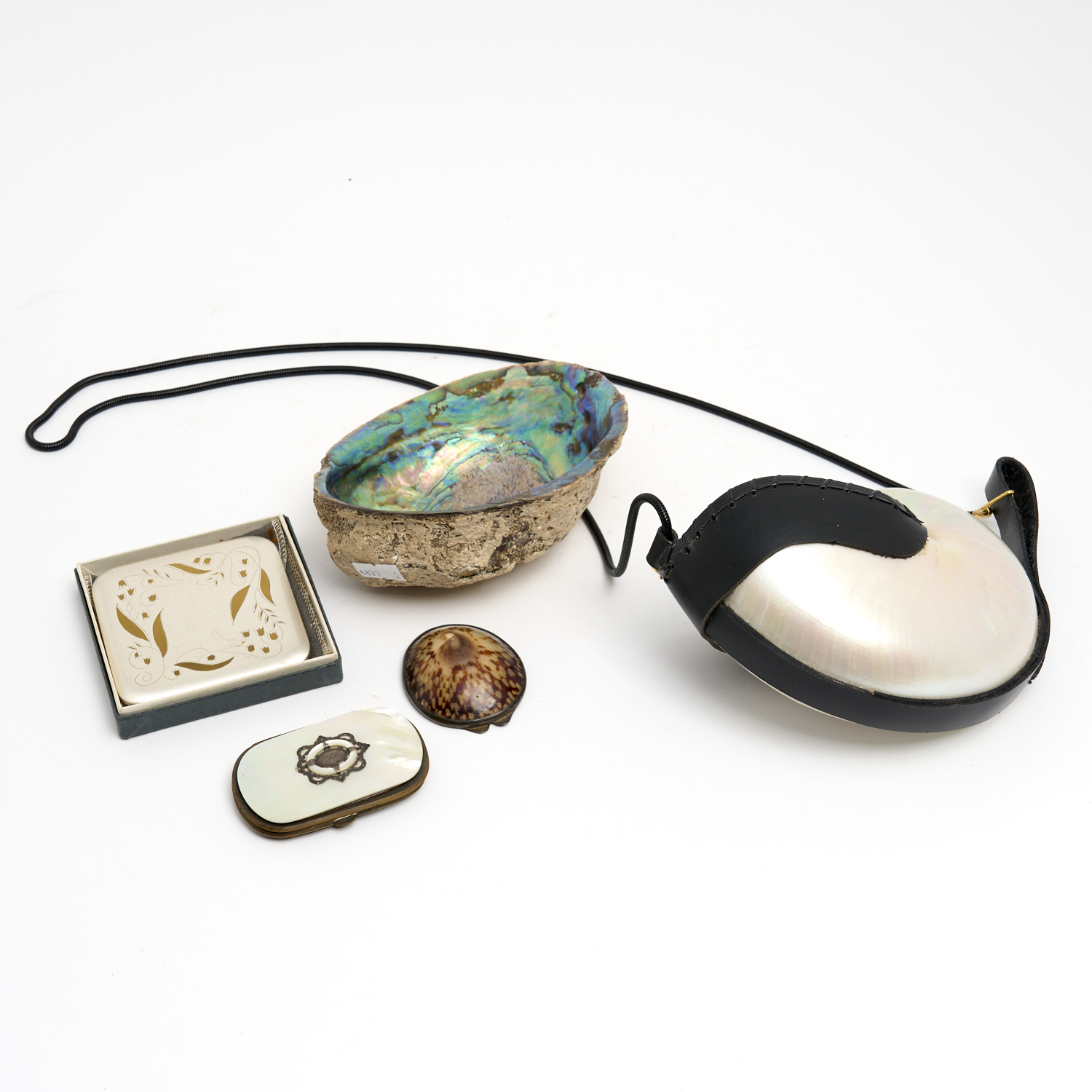 A NEWPORT COMPACT, TWO BOXES CRAFTED FROM SHELL, A SHELL EVENING PURSE AND A SHELL DISH L.16CM (LARGEST)