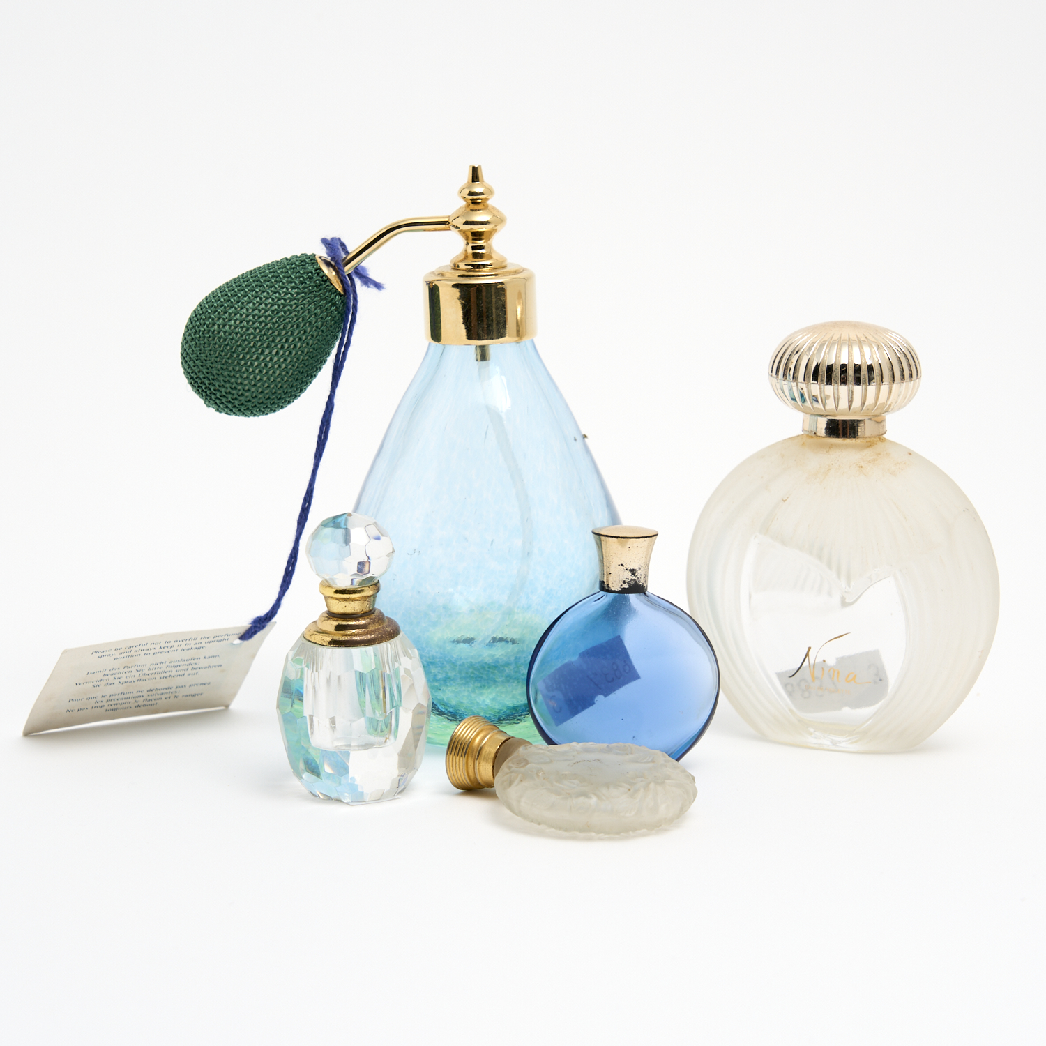 A COLLECTION OF PERFUME BOTTLES INCLUDING A LALIQUE FOR NINA RICCI PERFUME, A CAITHNESS PERFUME AND THREE OTHERS H.13.5CM (TALLEST)