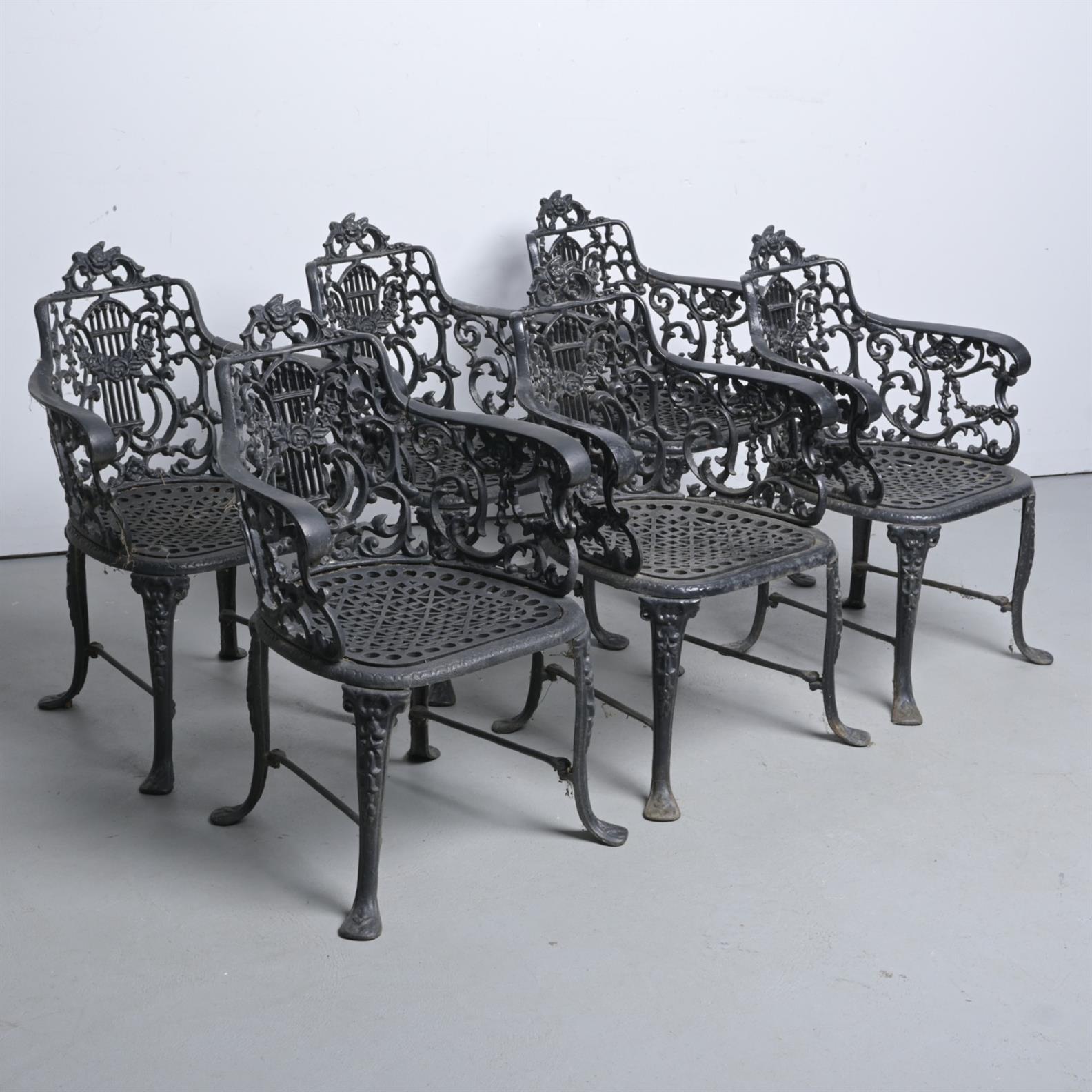 A SET OF SIX VICTORIAN-STYLE BLACK-PAINTED CAST IRON GARDEN ELBOW CHAIRS (77H X 50W X 54D CM) (THIS ITEM MUST BE REMOVED BY CARRIERS AT THE CUSTOMER'S EXPENSE. LEONARD JOEL STAFF CANNOT ASSIST CARRYING THIS ITEM)