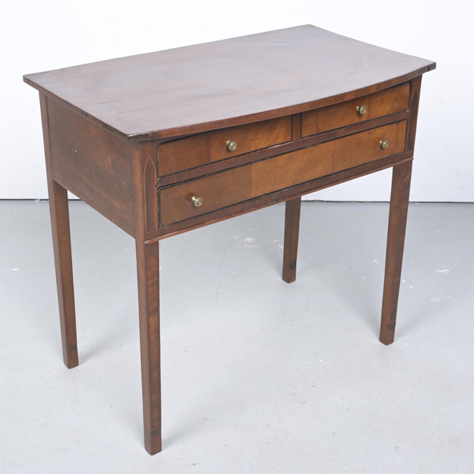 A GEORGE III SIDE TABLE, WITH BOW-FRONT TOP ABOVE FRIEZE DRAWERS (71CM H X 77CM W X 46.5CM D)