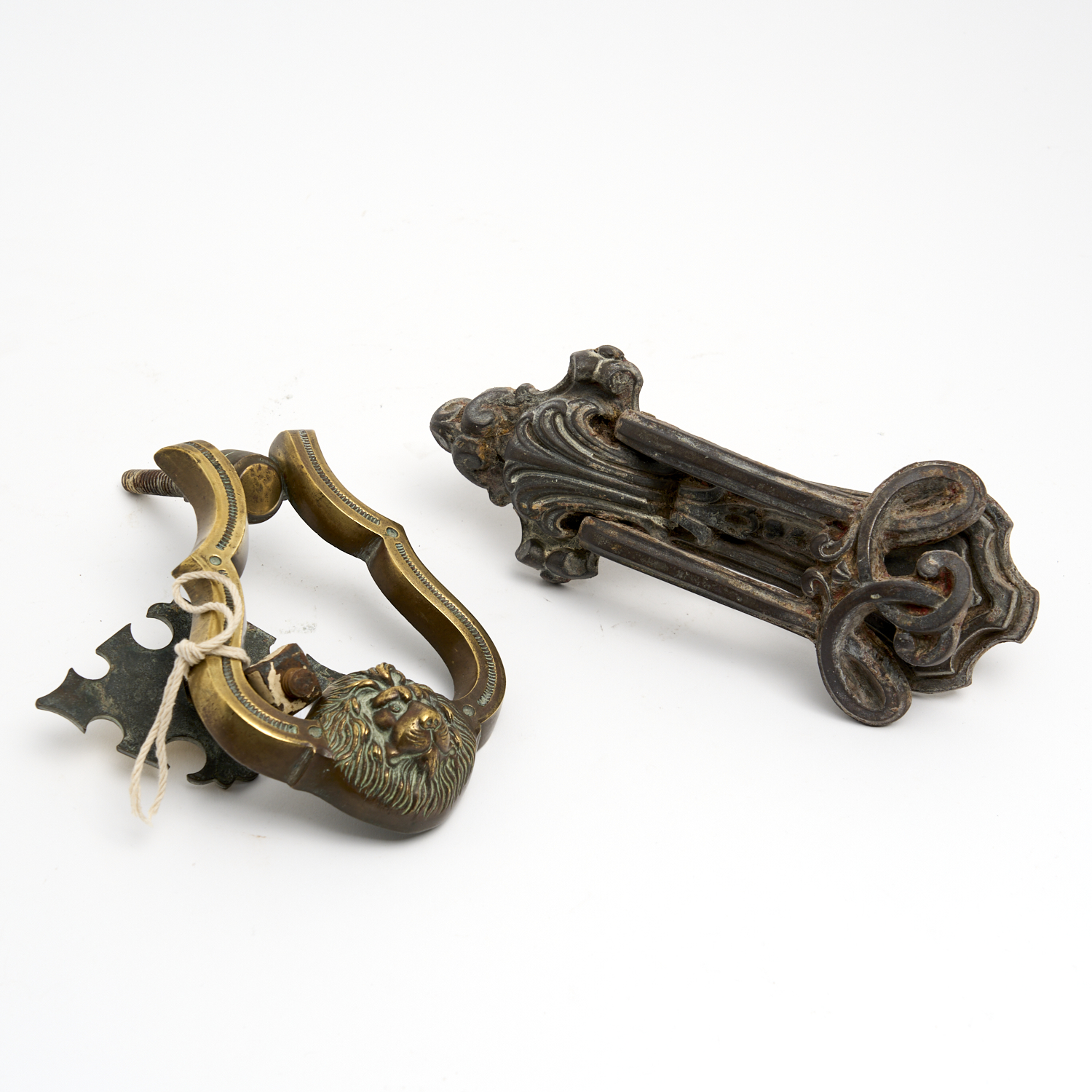 A VICTORIAN KENRICK CASTIRON DOOR KNOCKER AND A CAST BRASS LION HEAD DOOR KNOCKER H.22CM (LARGEST)