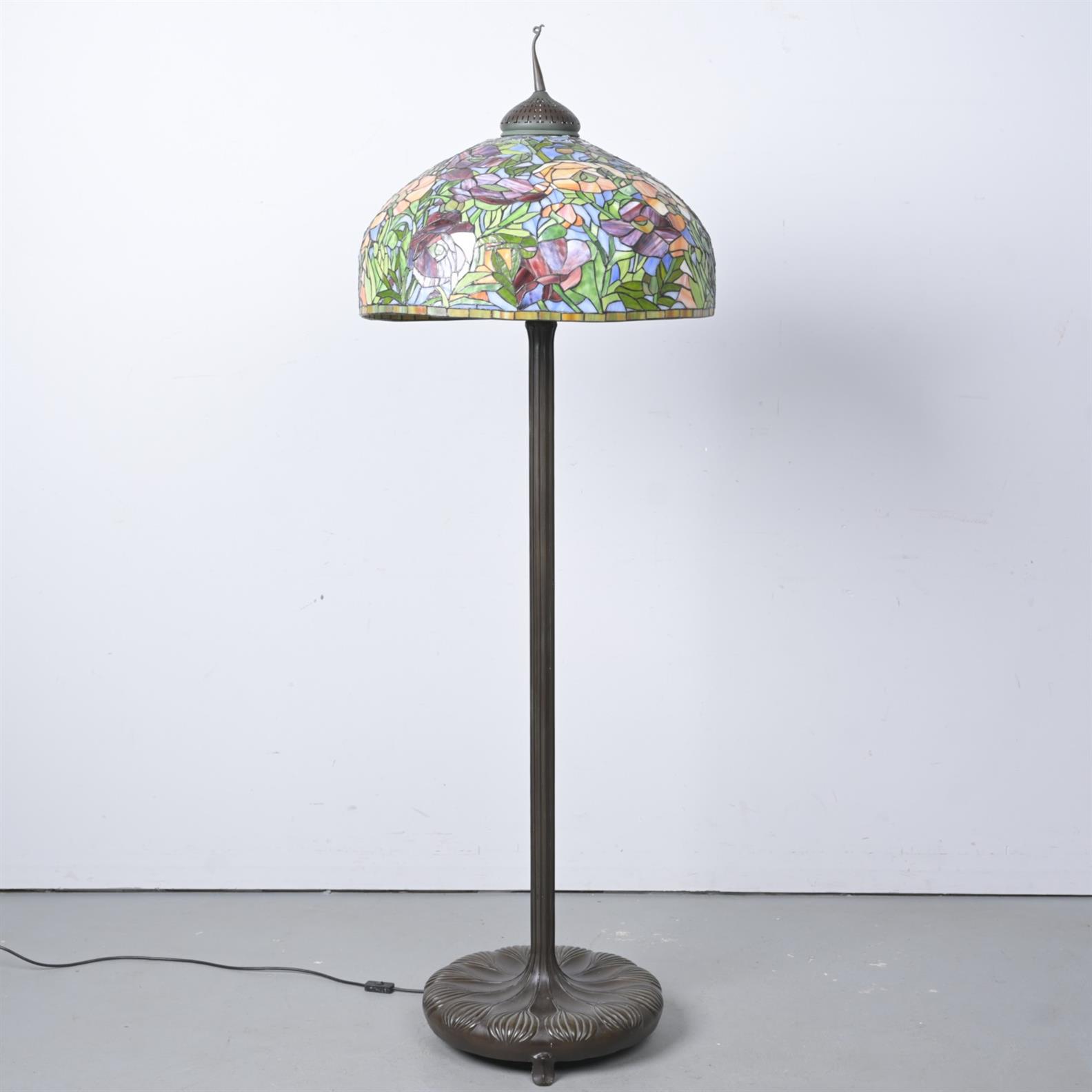 A LEADLIGHT FLOOR LAMP IN THE STYLE OF LOUIS COMFORT TIFFANY (198H X 63D CM) FRAGILE HANDLING - PLEASE NOTE LEONARD JOEL STAFF CANNOT ASSIST IN HANDLING / DELIVERY OF THIS ITEM