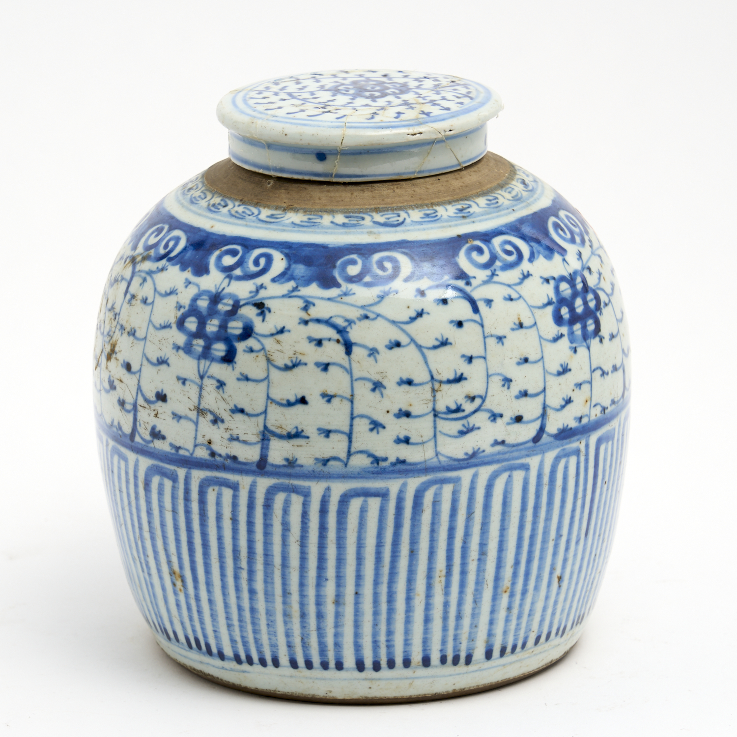 A CHINESE QING DYNASTY BLUE AND WHITE GINGER JAR WITH COVER (A/F) H.23CM