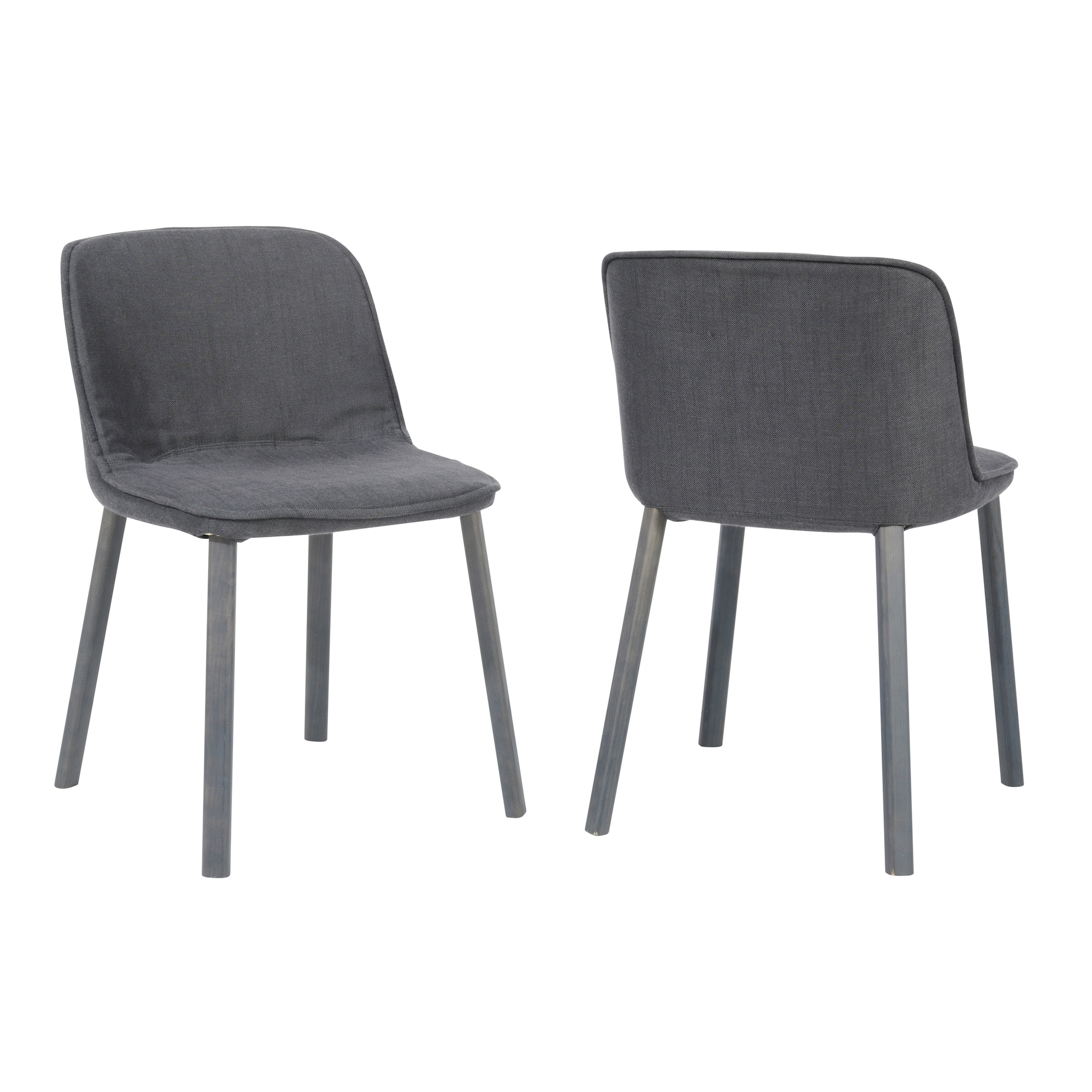 Softly curved dining chair on a four leg base. Charcoal removable woven fabric upholstery covers a polyurethane shell, legs of a matte charcoal finish.
