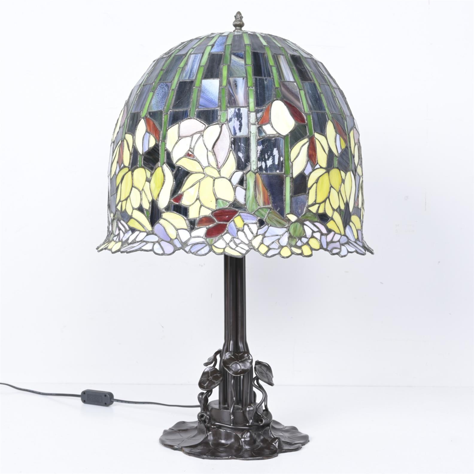 A LEADLIGHT TABLE LAMP IN THE STYLE OF LOUIS COMFORT TIFFANY (69H X 38D CM)