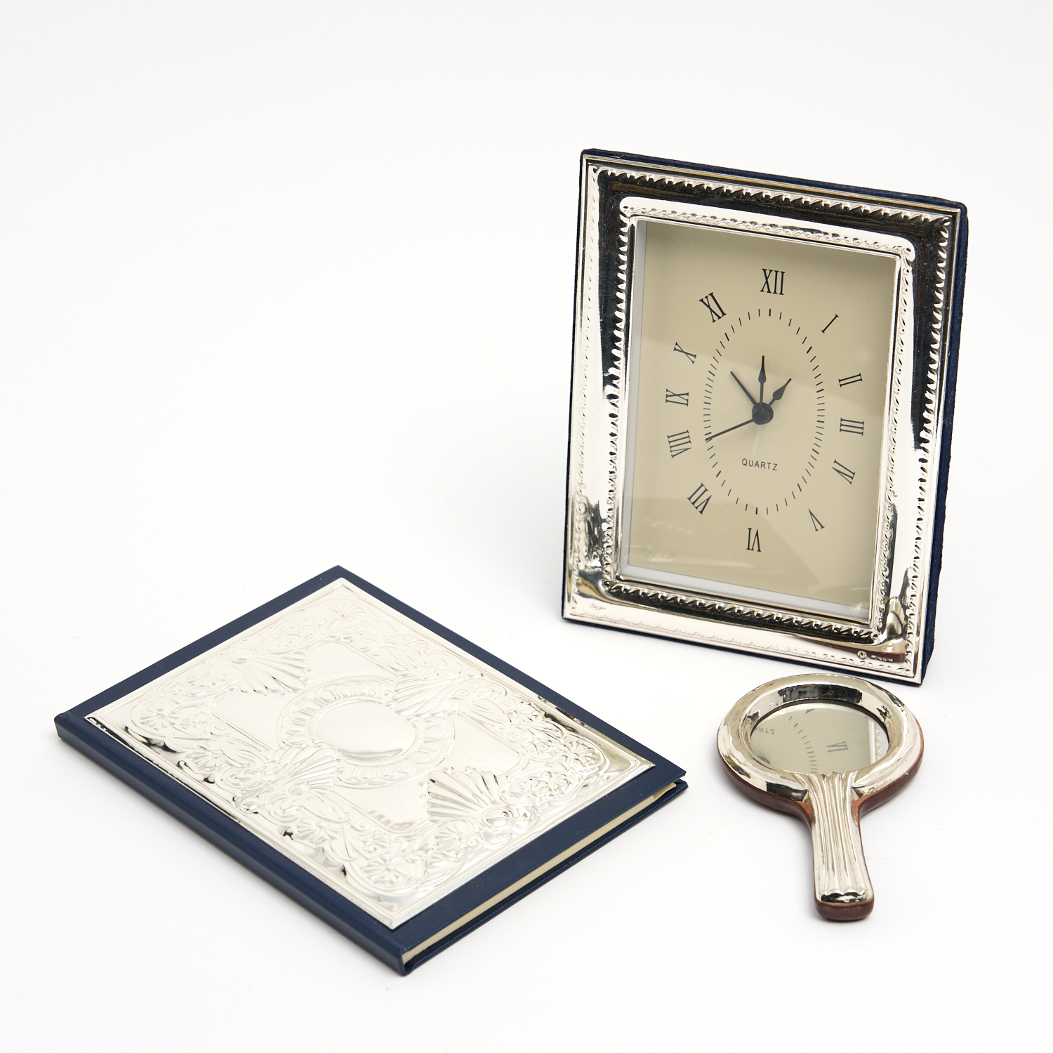 AN ADDRESS BOOK WITH A 925 SILVER EMBOSSED PANEL, 925 SILVER HAND MIRROR AND A SILVER QUARTZ CLOCK