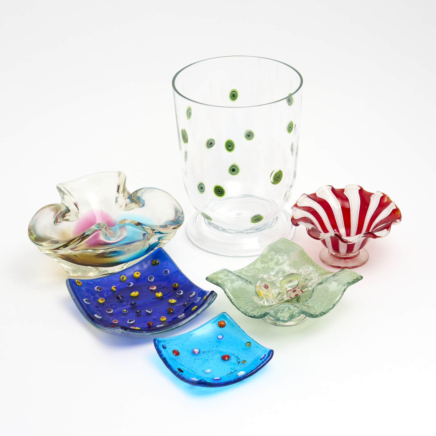 A COLLECTION OF MURANO AND OTHER ART GLASS ITEMS INCLUDING VARIOUS DISHES, SWEETS, AND A VASE H.19CM (TALLEST)