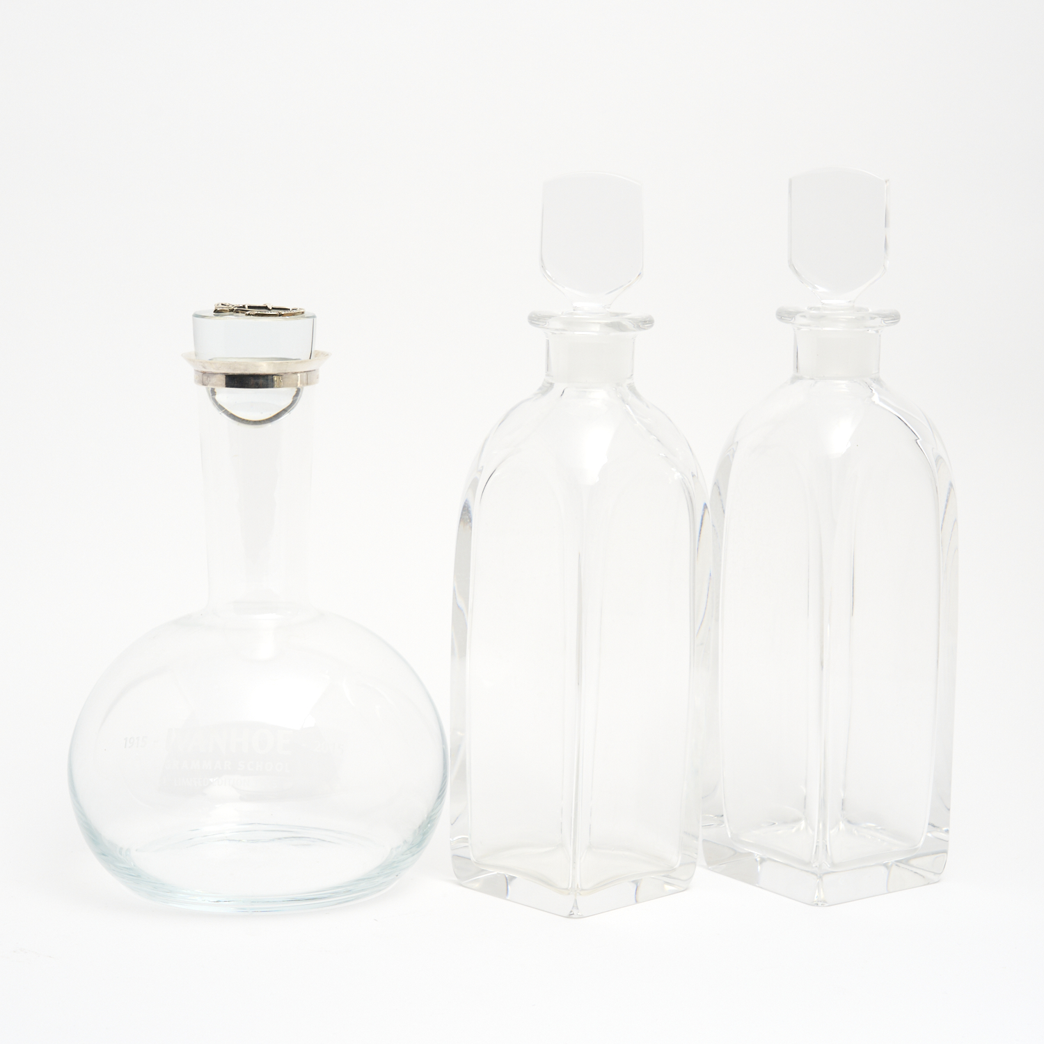 THREE GLASS DECANTERS INCLUDING A GEORG JENSEN STERLING SILVER MOUNTED DECANTER (WITH IVANHOE GRAMMAR SCHOOL PRESENTATION ETCHING) AND TWO ORREFORS H.30CM (TALLEST)