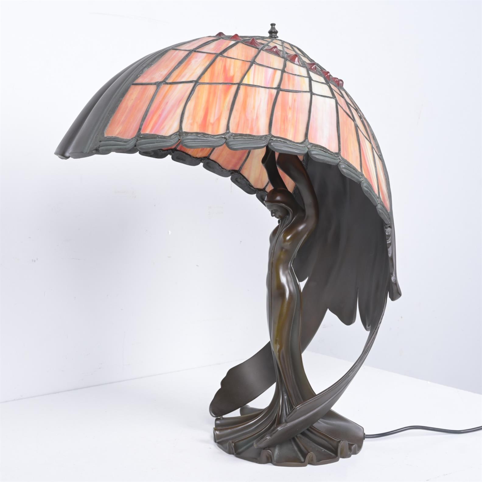 A LEADLIGHT TABLE LAMP ON A BRONZED FIGURINE BASE (70H X 54WCM)