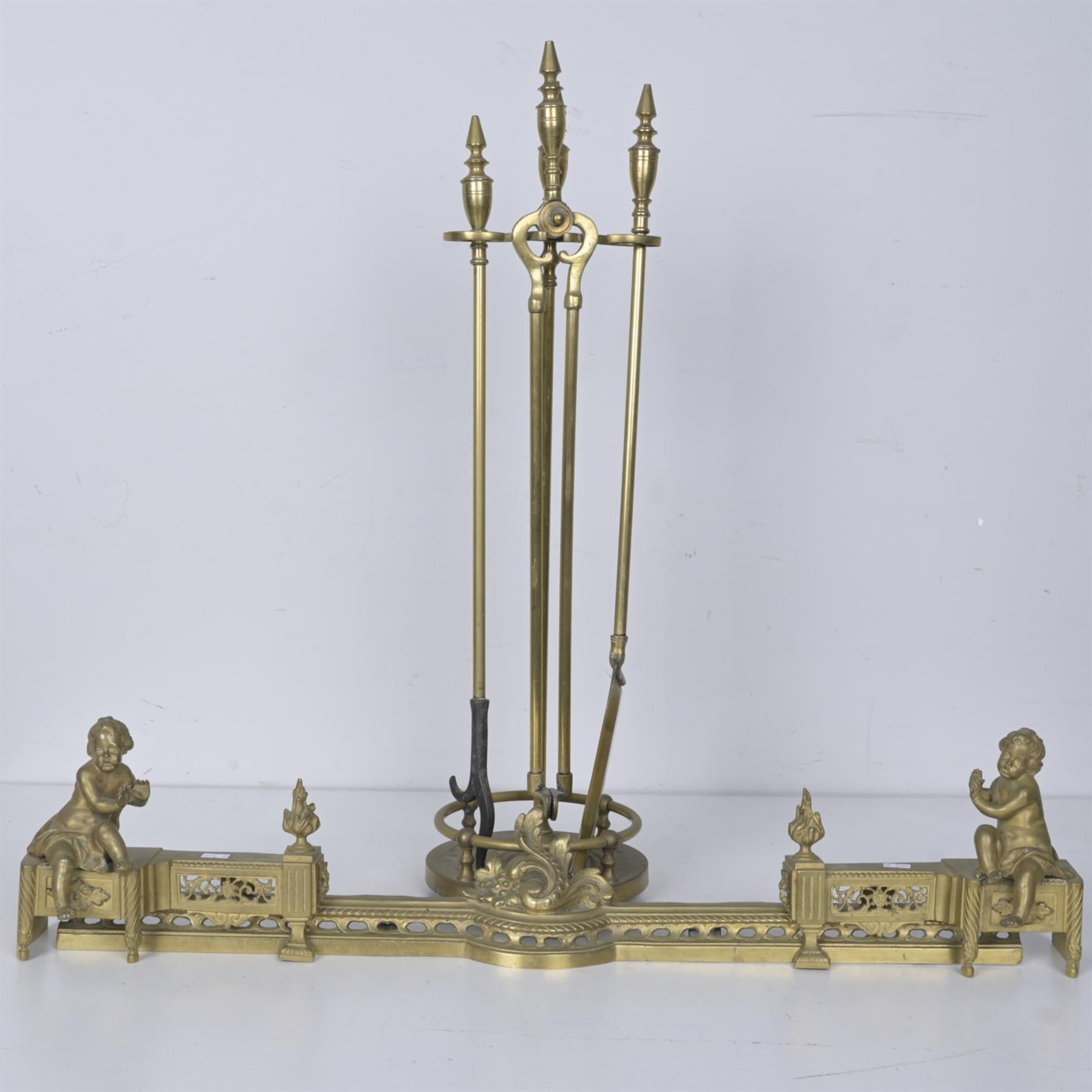 AN ANTIQUE FRENCH BRASS HEARTH FENDER, WITH A SET OF FIRE TOOLS (FENDER 120W CM)